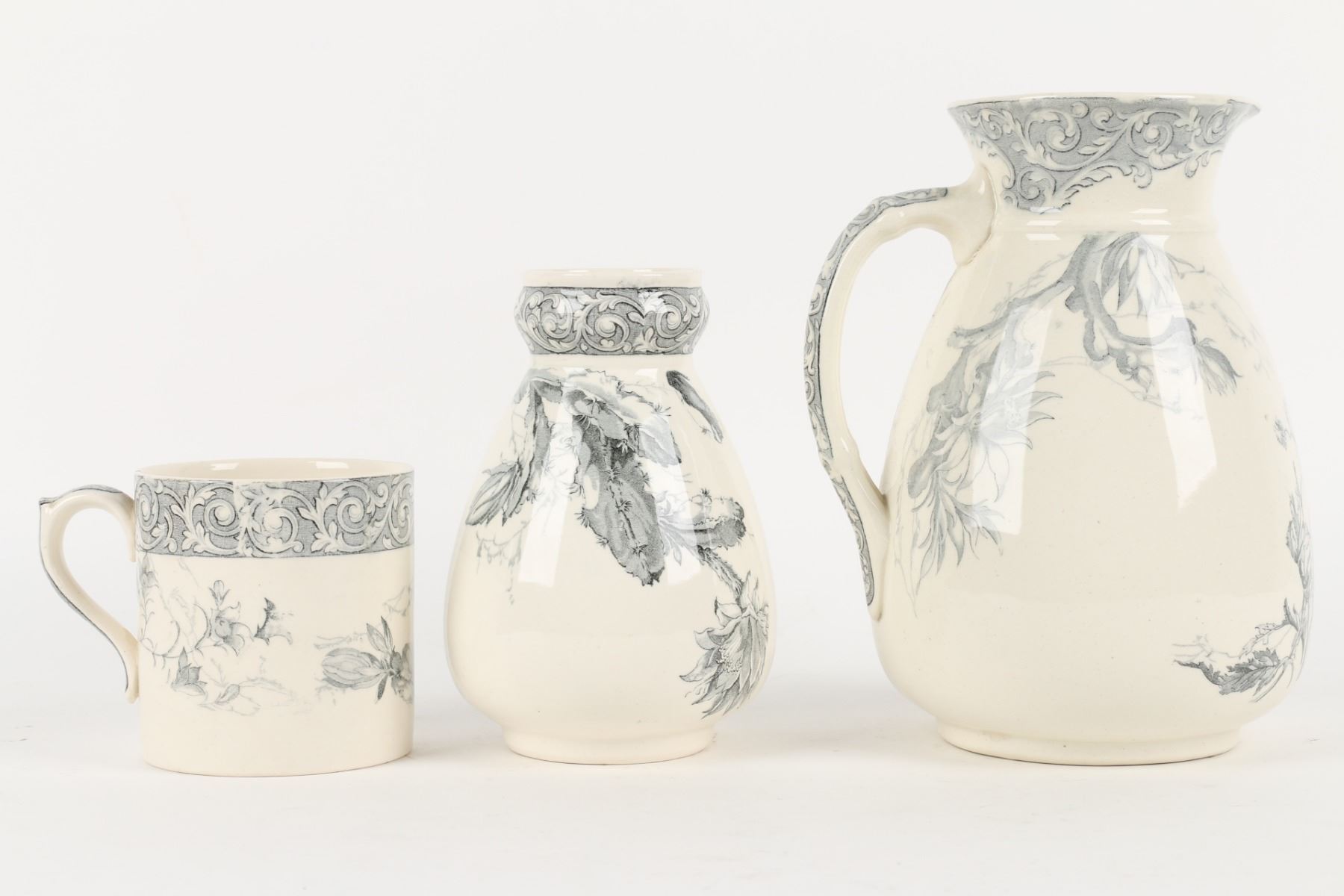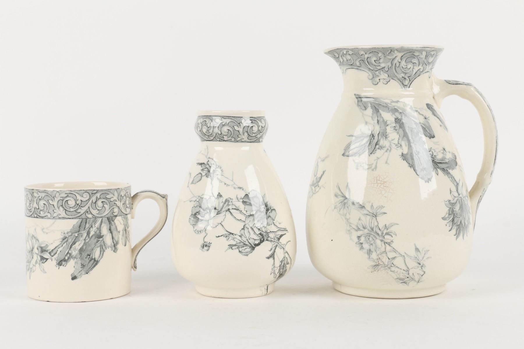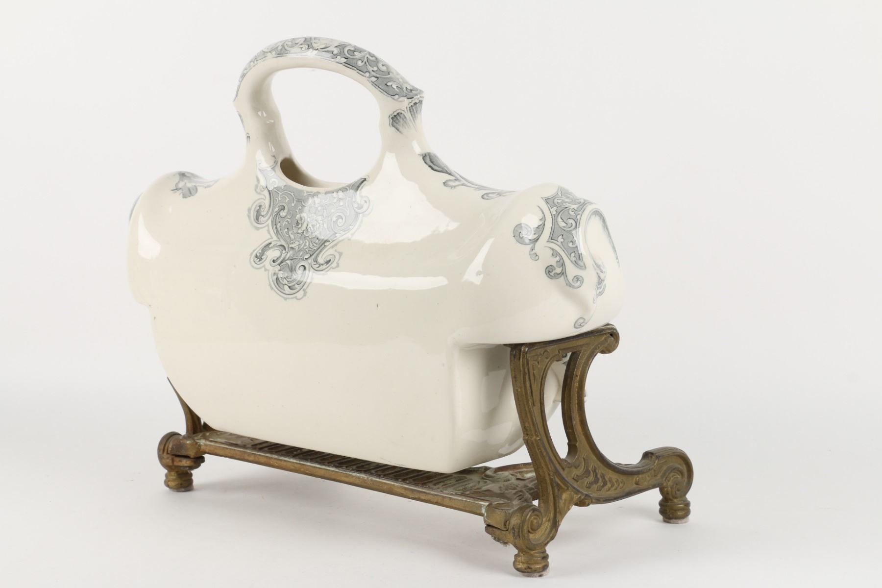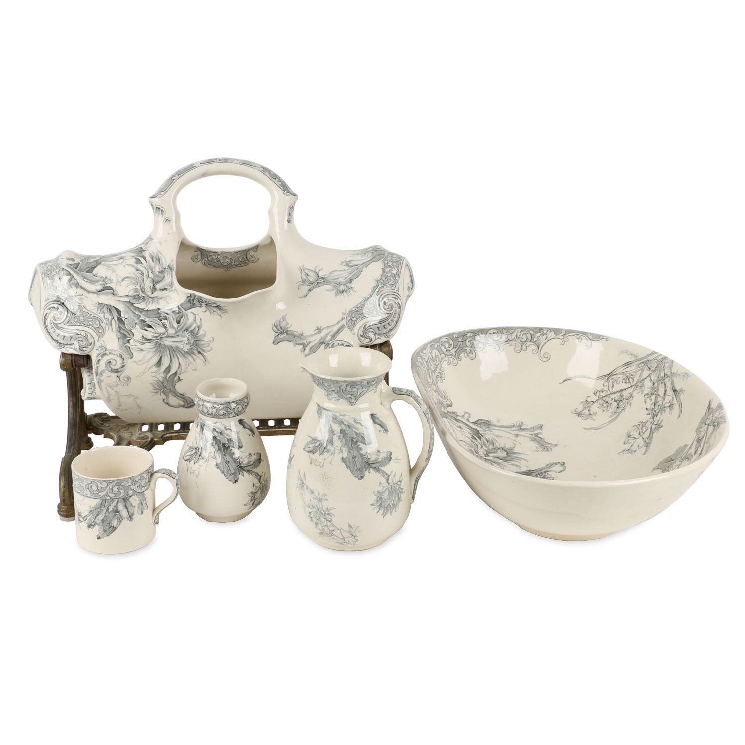 Lot 83 - Circa 1900. Six (6) Pieces including a waste pitcher on a tilting stand. A faint, contained hairline in the inside of the pitcher. Pitcher- 17.5" x 10" x 5.5", base- 14.5" x 8" x 6", basin- 18" x 13" x 4.5", 18.5" x 6". $400-600.