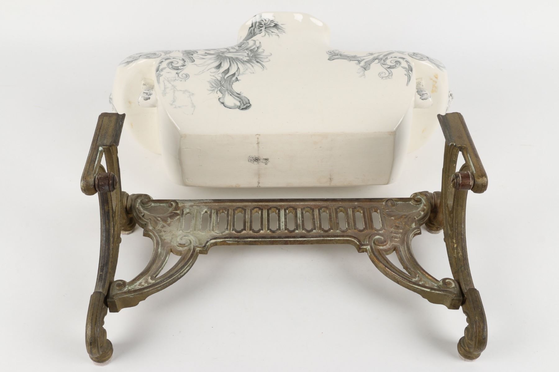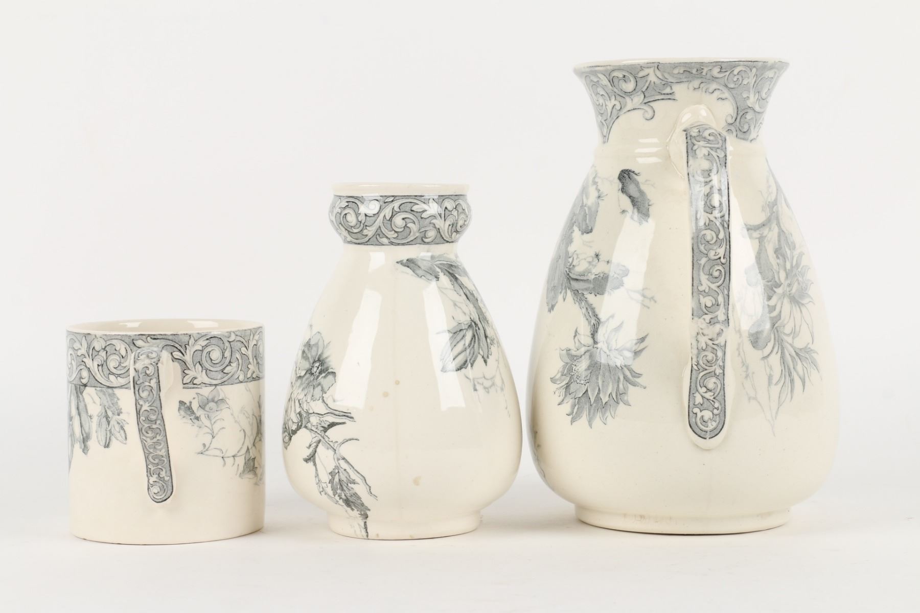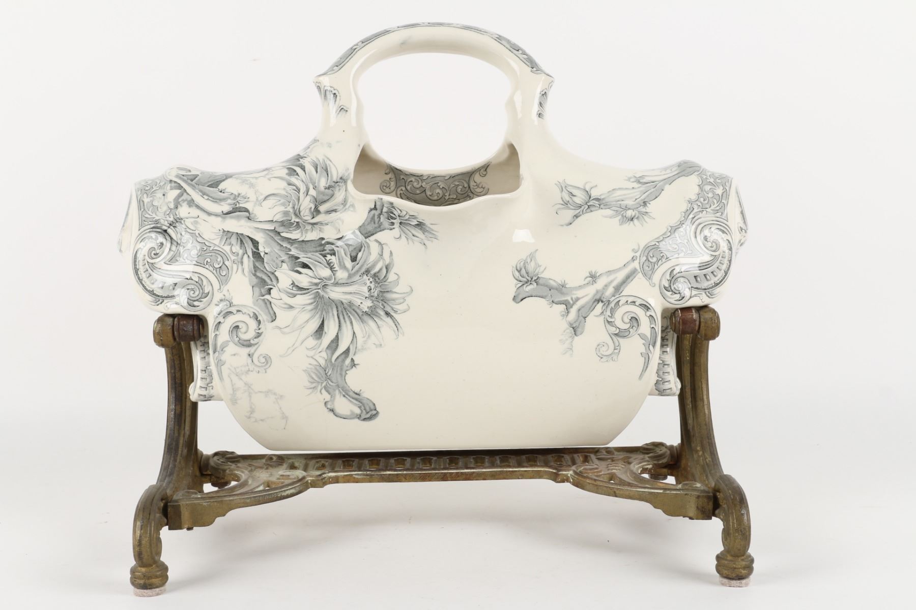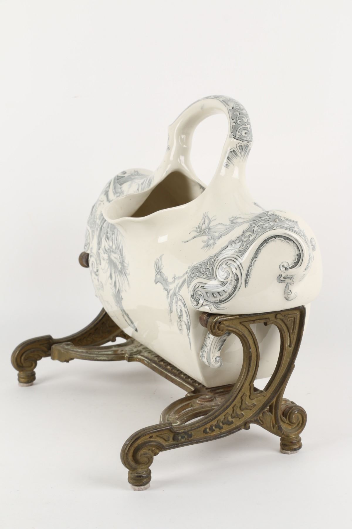 Lot 83 - Circa 1900. Six (6) Pieces including a waste pitcher on a tilting stand. A faint, contained hairline in the inside of the pitcher. Pitcher- 17.5" x 10" x 5.5", base- 14.5" x 8" x 6", basin- 18" x 13" x 4.5", 18.5" x 6". $400-600.