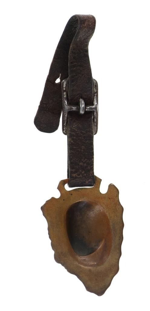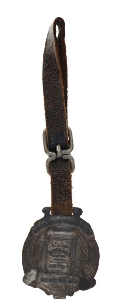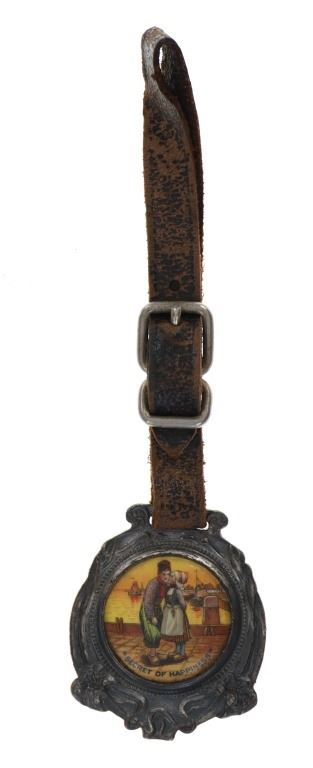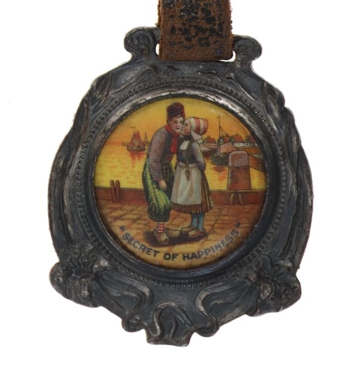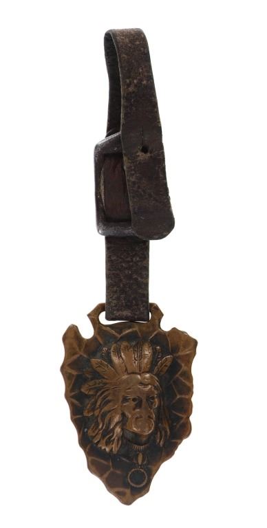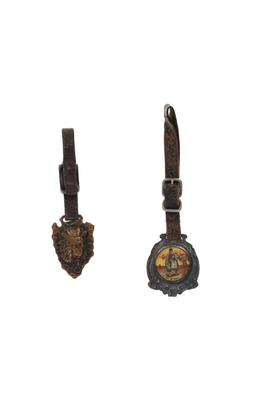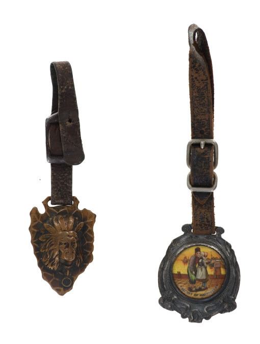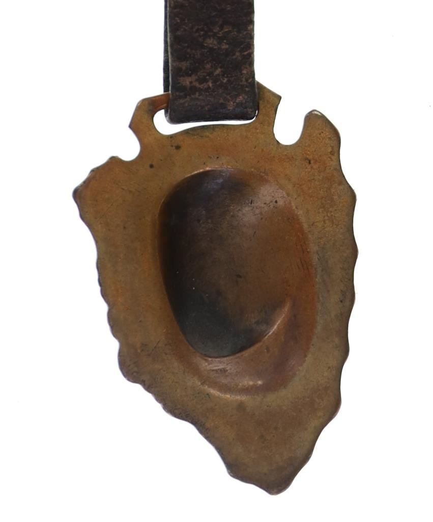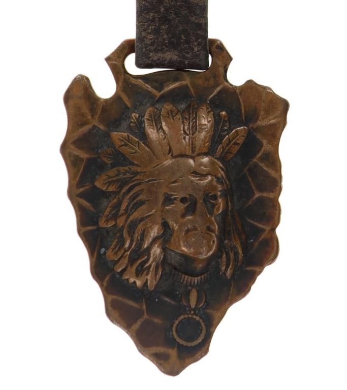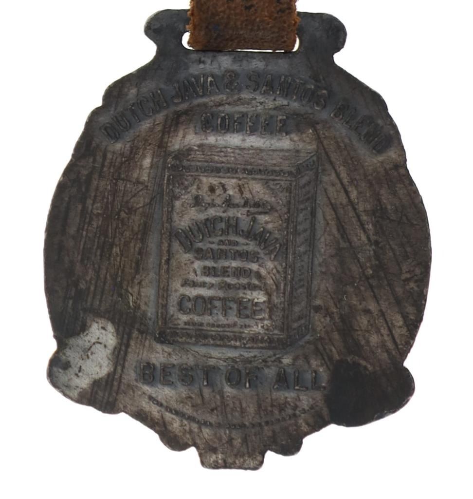 Featured in this lot is this rare Dutch Jave and Indian head arrowhead watch FOB's. There are two watch FOB's in this collection. The first is a watch for from Dutch Java & Santos Blend Coffee that shows a celluloid scene of a Dutch couple and reads "Secret of Happiness." The FOB reads on the back as follows: Dutch Java & Santos Blend Coffee - Best of All. The second is a Indian head arrow head watch FOB that shows a brass arrowhead with an Indian head embossed on top of it. The condition of this collection of watch FOB's is good with no obvious signs of damage and shows good overall condition. The measurement of these watch FOB's are 9" x 1 1/2" and 6 1/4" x 1 1/4".