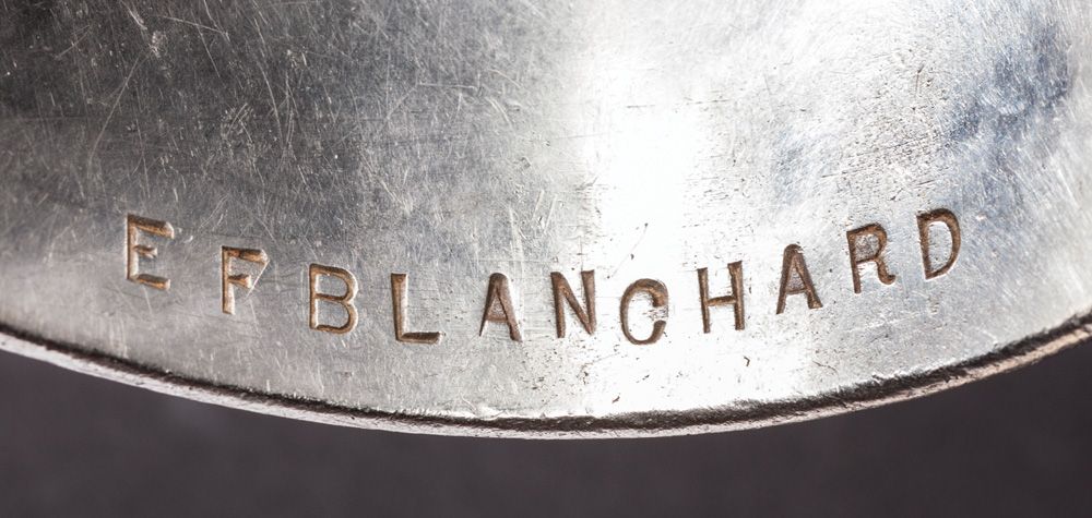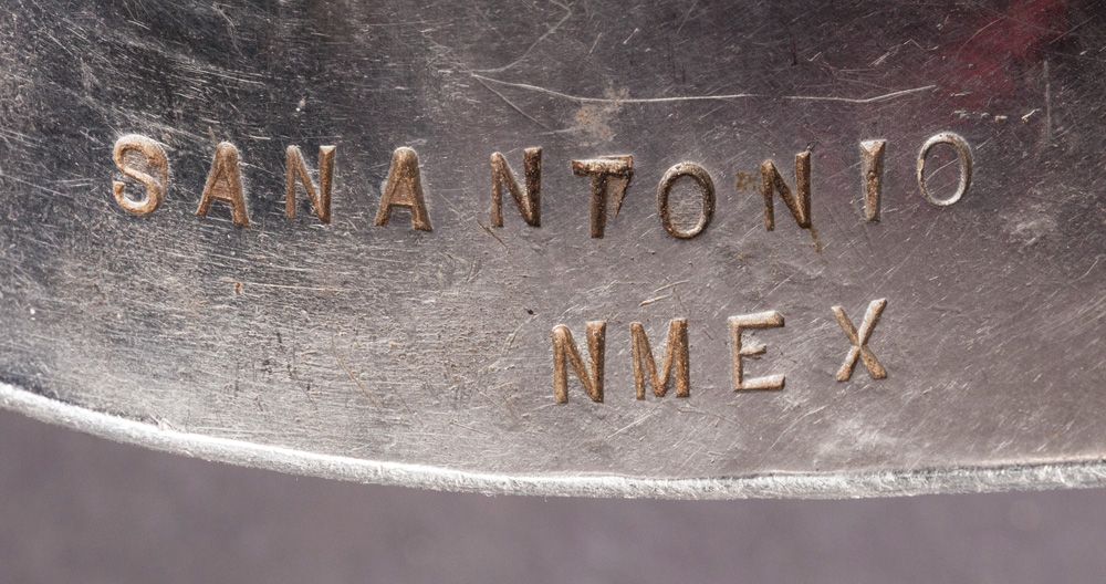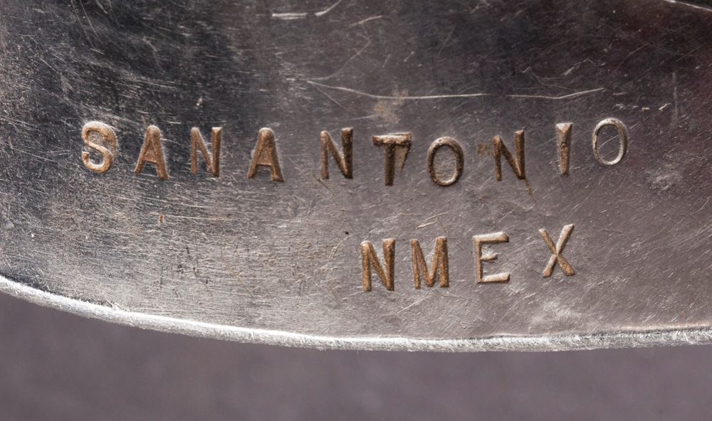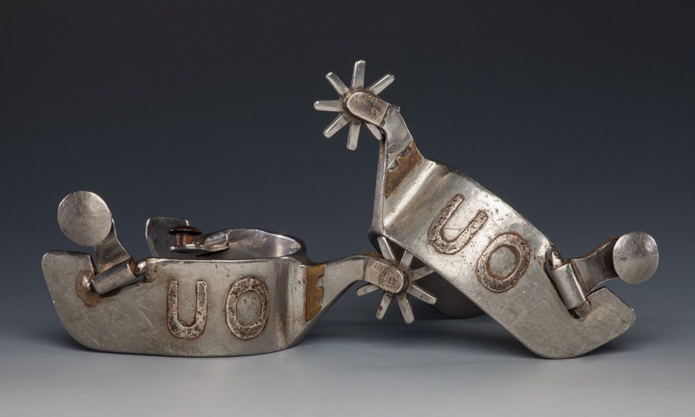 Rare E. F. Blanchard New Mexico Spurs. Late 1940s "E.F. BLANCHARD / SAN ANTONIO / N. MEX" marked, special order iron spurs with the seldom-seen "pre-Yucca" stamp. Overlays personalized with letters UO for Wallace Opie's U Circle Ranch. Swinging buttons, 1 1/2", 10-point rowels. PROVENANCE: Dick Powell Collection, Casa Grande, Arizona