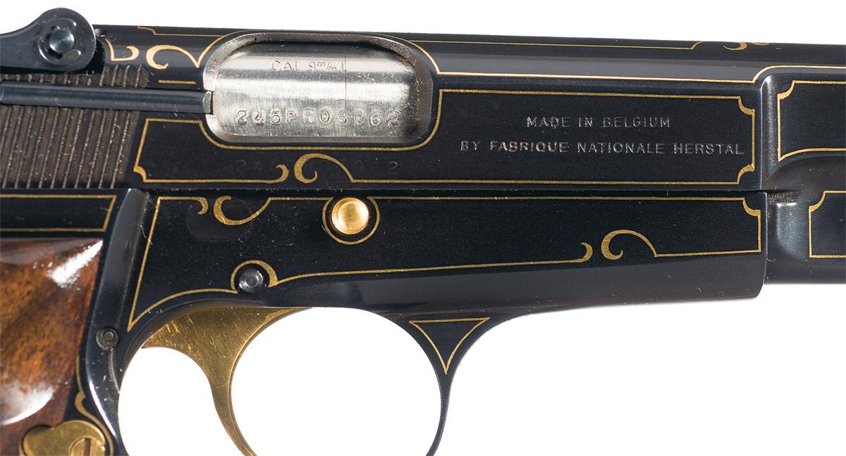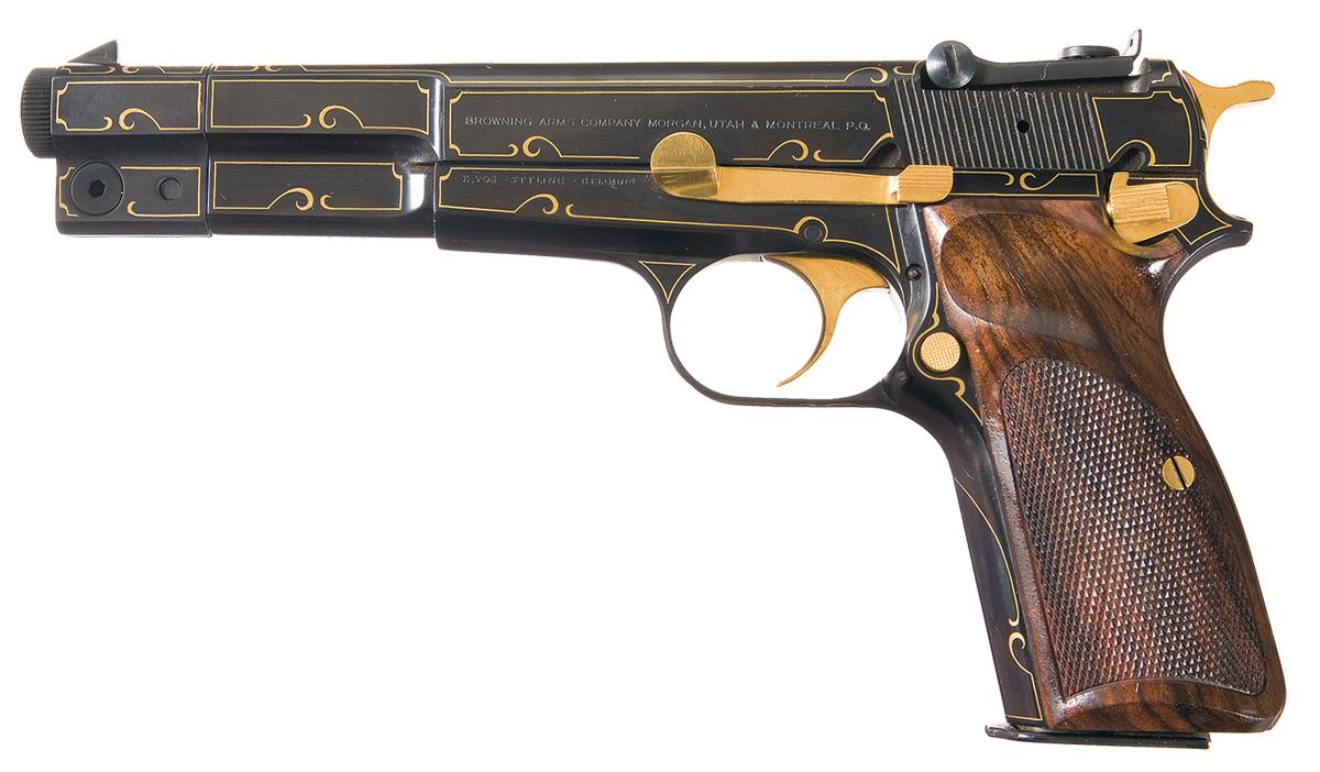 This is a very rare early production Browning HP "GB" competition model with rare gold inlaid borders on each panel of the entire pistol and gold plated small parts. These pistols were manufactured around the 1987 time frame and not cataloged for sale in the U.S. by Browning Arms Company. These competition model pistol feature a fixed front sight and adjustable rear sight, a 6" match barrel, with front counterweight, a serrated spur hammer, smooth trigger, and 13 round double stack magazine. This specific pistol has been fitted with extra fancy set of factory checkered two piece walnut grips. The sides of the slide have the standard Belgium address on one side and the Browning address on the other and the left side of the frame is marked "E.VOS - STYLING - BELGIUM". As noted, the slide, frame, trigger guard and grip straps feature decorative gold inlaid bordering that are exceptionally well executed. The pistol is finished blue with a gold slide hold back, thumb safety, hammer, magazine release and trigger. All numbers match.