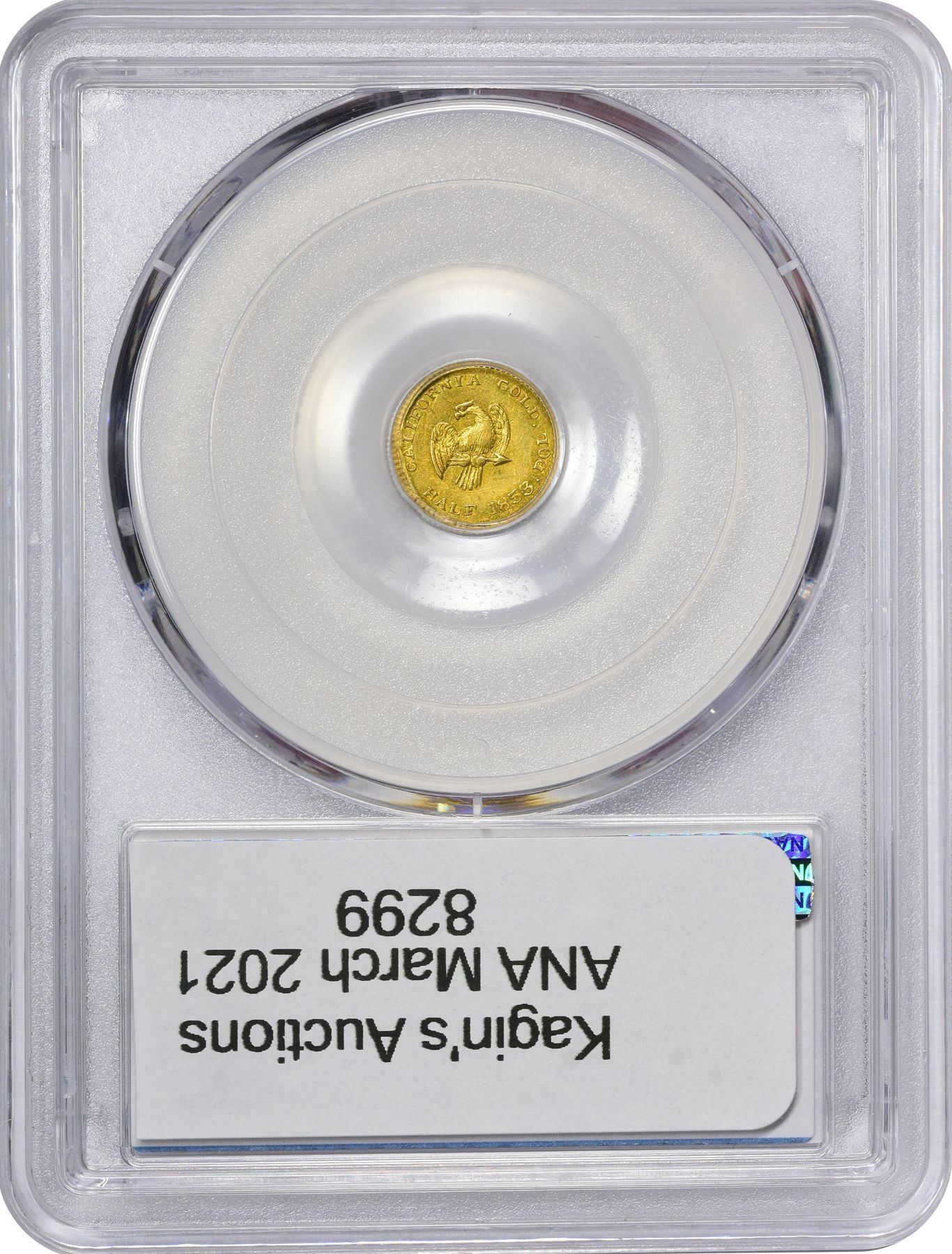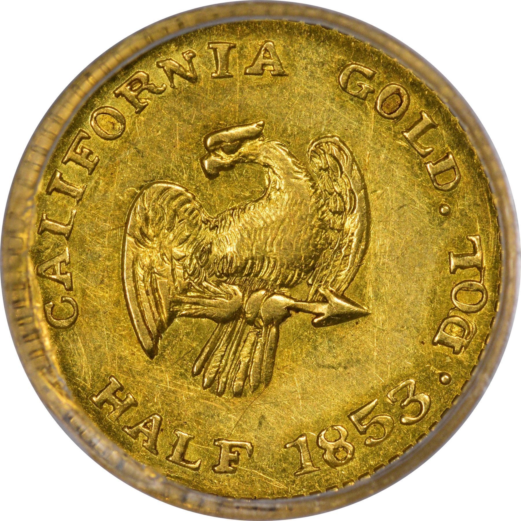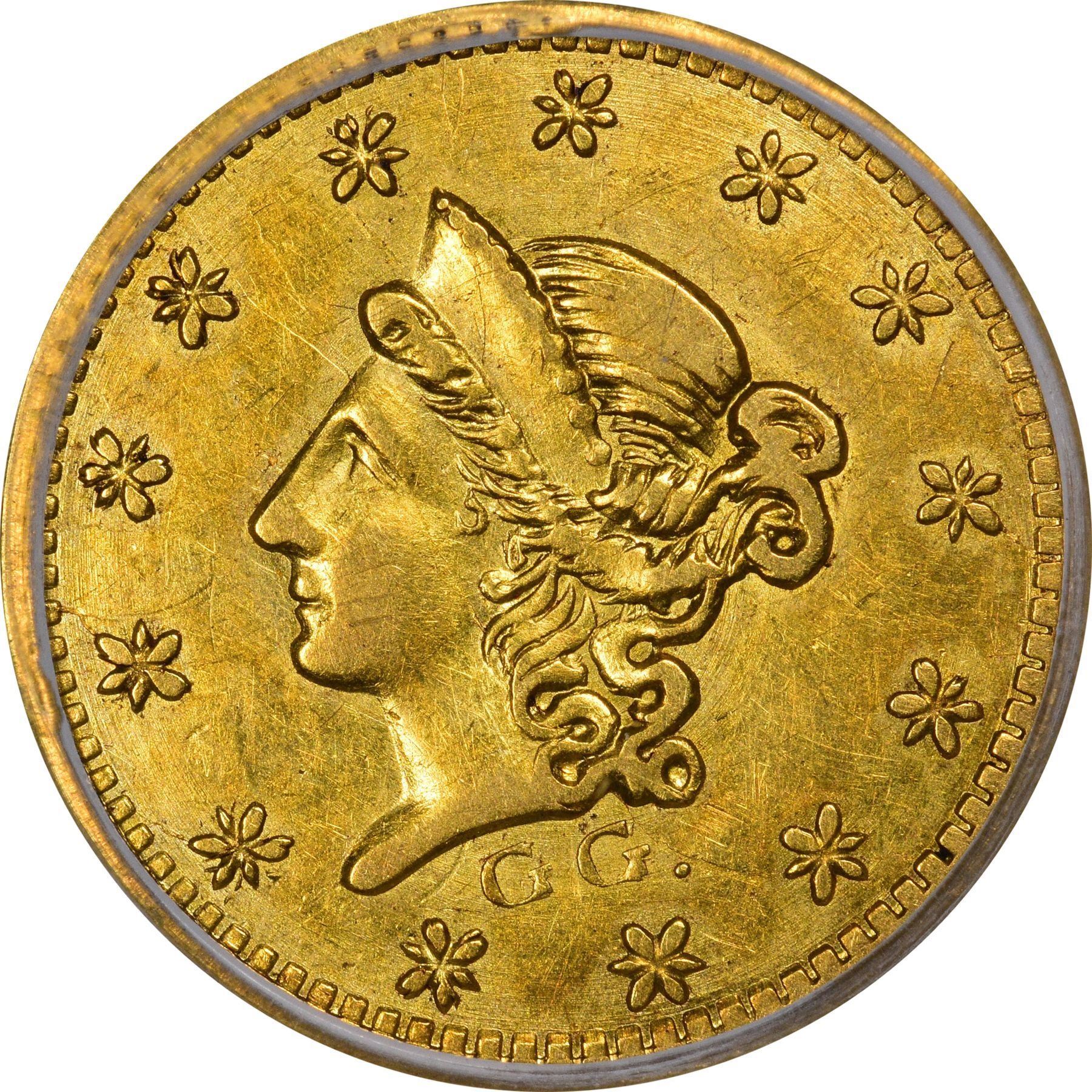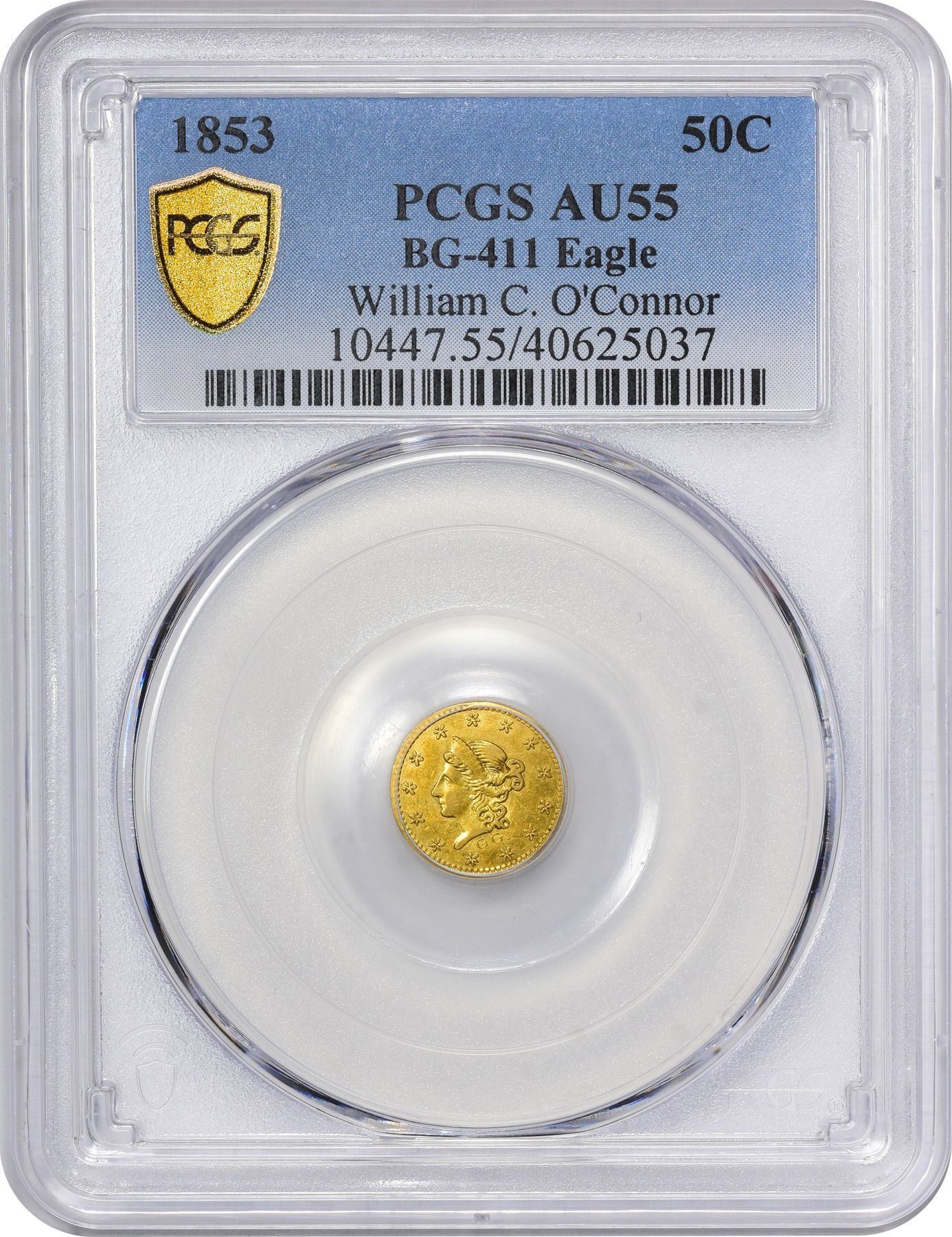 Description: 1853 G G. round Half Dol., BG-411. PCGS AU55. Rarity 7. Broad Liberty head similar to head of BG-402 and BG-403, G G. below, 13 stars around; blundered Eagle reverse, DO repunched (originally D overlapping O), part of extra L between OL. Struck by Frontier, Deviercy & Co. for Gaime, Guillemot & Co. Sharply struck, bright gold color. PCGS AU55 Eagle William C. O’Connor (PCGS# 10447). PCGS POP 1 + 5.
