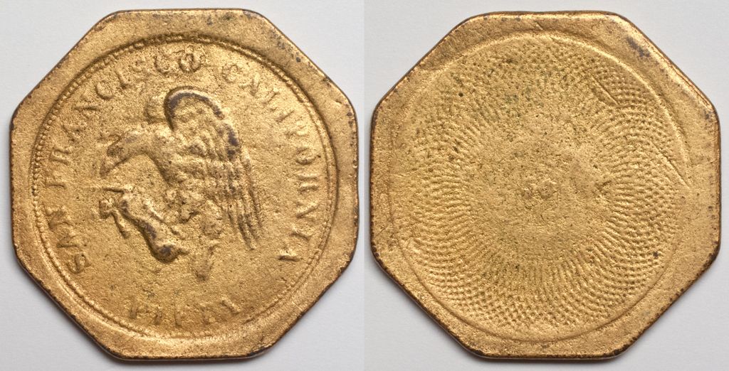 Features a Mexican style eagle with a rabbit in its talons. 'SAN FANCISCO CALIFORNIA' above and 'FIFTY' below. 'Crude' example, but still rare. With original Bill Weber envelope. Bill Weber Collection. City: San FranciscoCounty: State: CADate: