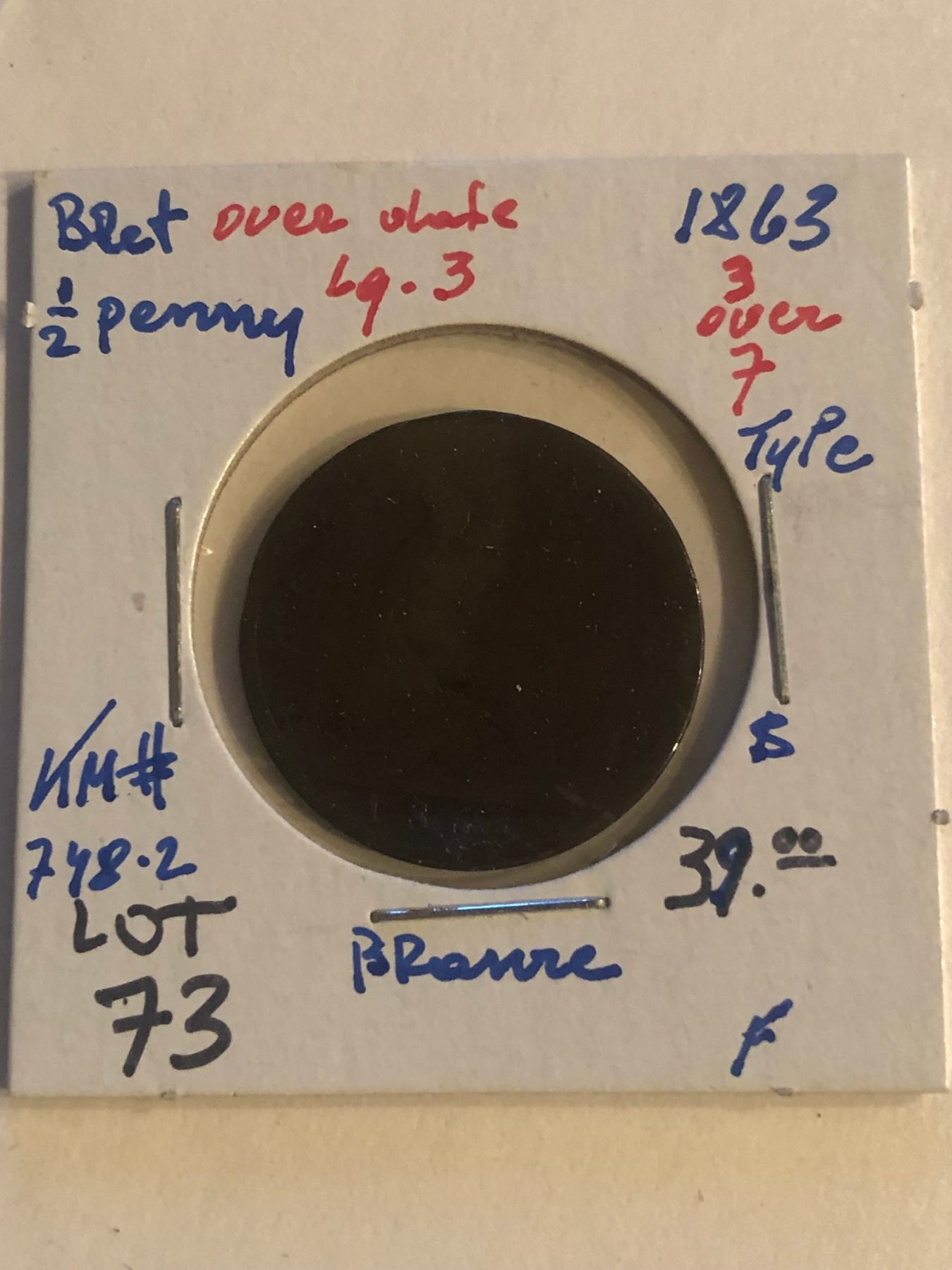 Rare Early 1863 3 OVER 7 Large 3 Great Britain 1/2 Penny Fine Grade