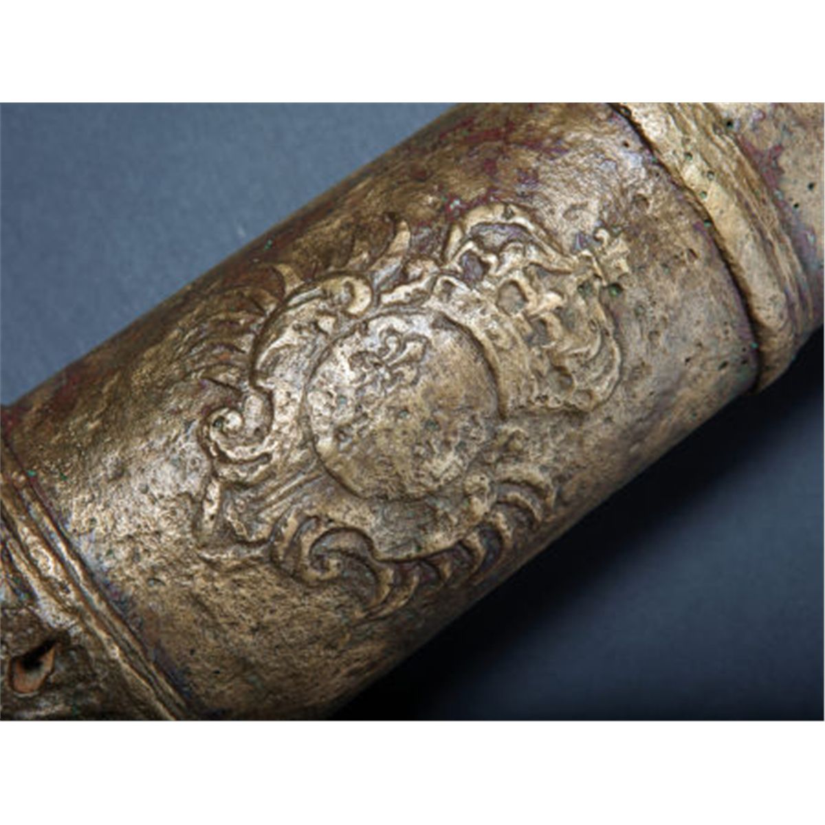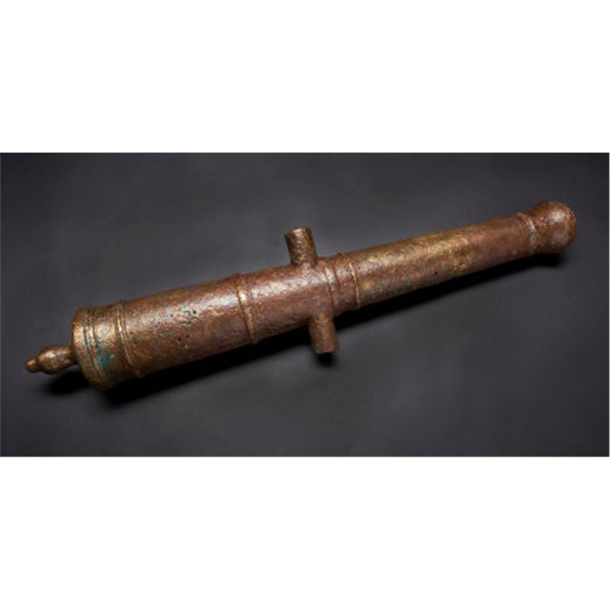 Rare Early 18th-Century Muzzle Loading Deck Cannon Of French Compagnie d'Occident c. 1717. 35 1/2-inch long bronze swivel deck cannon with molded muzzle and 5-banded tube. Raised riband reading: Compagnie/D'Occident; raised coat of arms of the Company and nearer breech the Royal seal of France. 1 5/8-inch diameter trunnions and nipple-type cascabel. Sold together with an extensive file on the history of the trading company and of John Law, the colorful founder of the company. Like the lot prior to this one, these cannons are very unique and are part of the history of the Mississippi river valley and the settlement of early America. Relatively small in size, these guns are perfect for historic display [for more information on the history of John Law and the French trading companies in America go to: [http://memory.loc.gov/intldl/fiahtml/fiatheme2c2.html].Condition: Good. Showing age wear and patina. Cannon has been professionally conserved and stablized for display.