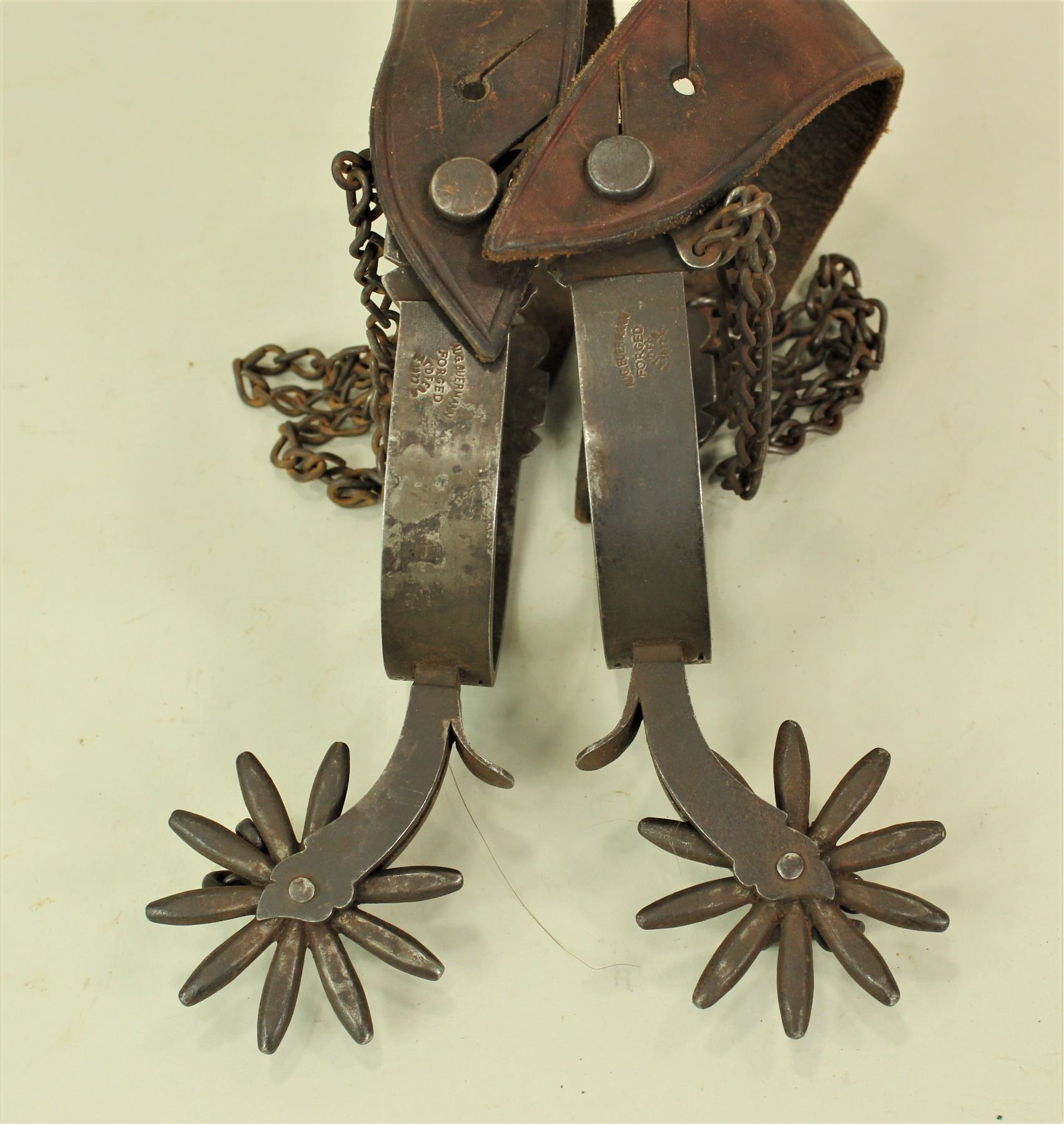 An extremely scarce pair of massive iron spurs with deeply engraved iron and fine twisted silver wire inlay, with huge rowels, jingle bobs and dove wing straps. Beautifully marked and showing great patinaed condition.