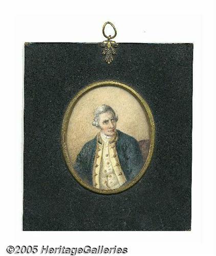 <B>Rare Early Miniature Portrait on Ivory of Captain James Cook</B></I> One might ask why Captain Cook (1728-1779) renowned South Seas explorer, belongs in an Americana sale. The answer is that one of his single accomplishments was the discovery of our 50th state, Hawaii! There were only a few period portraits of Cook. The most famous, by Nathaniel Dance, was widely distributed in the form of copy engravings at the time, and it is the central, portrait portion of that painting on which this unsigned miniature is closely based. Absent an artist's signature, it is impossible to date this miniature portrait precisely. Certainly such paintings were being done in the last quarter of the eighteenth century, although they reached their zenith of popularity in the early 19th century. We suspect an early date for this piece, since there would seem to be less reason to paint this image as the years after Cook's death passed. The black lacquered wood frame is almost certainly original to the piece, and still has its original brass hanging loop. Condition of the painting itself is flawless, and the frame is excellent and unmolested. Oval portrait is 2.375" x 3.125", the frame 4.75" x 5.25". A wonderful early artifact. Lot:252