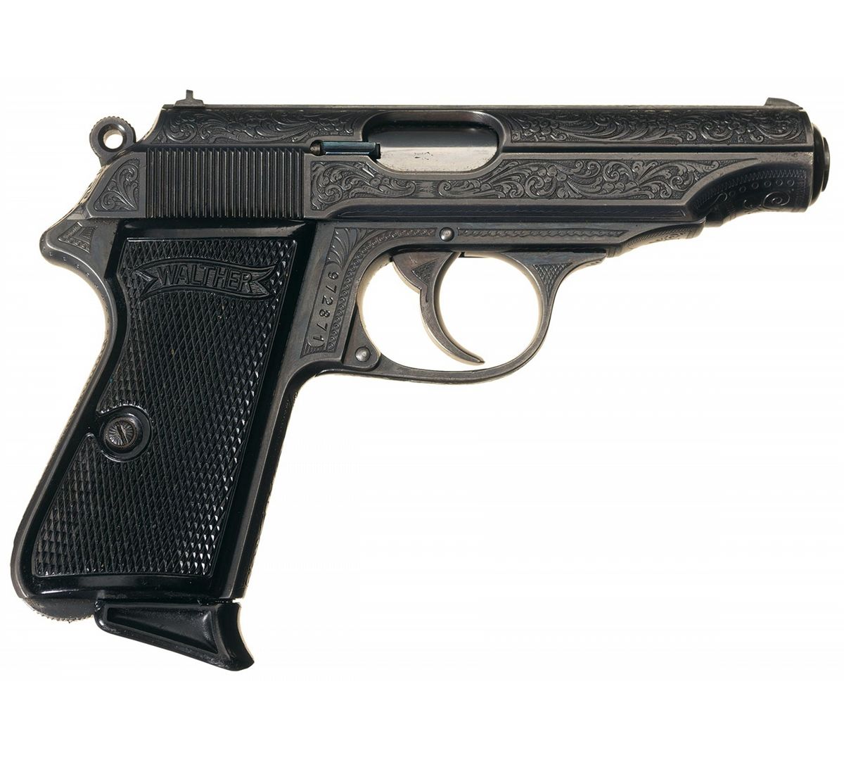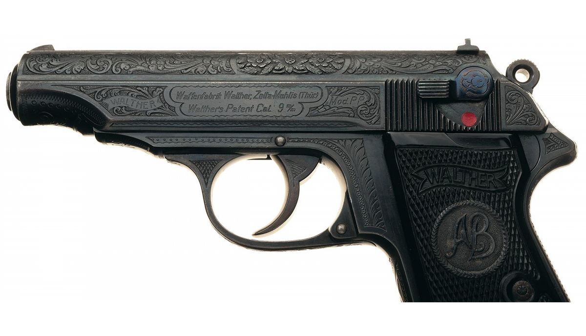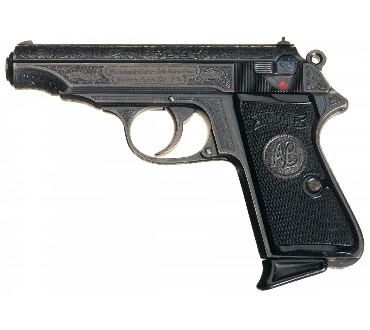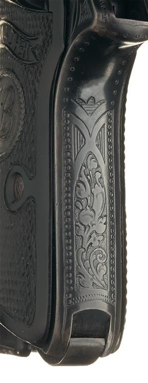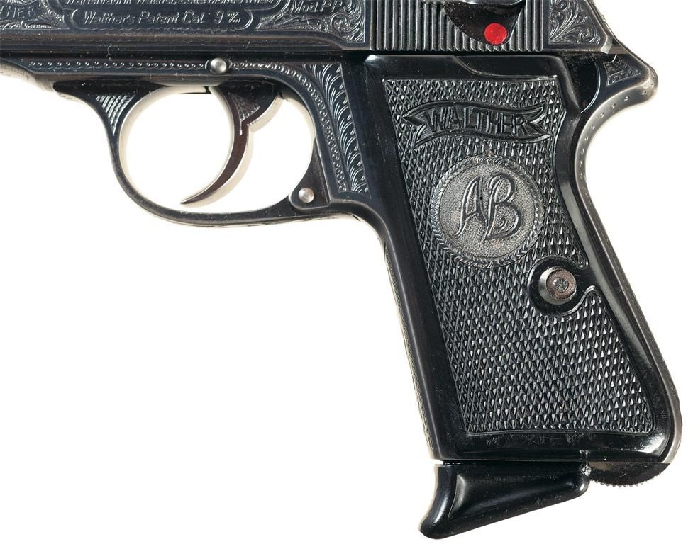 Very fine with 85% of the original blue finish overall with edge and high spot wear with beautiful meticulous engraving that could only be performed by a Master Engraver at the Walther factory. The grips are also very fine overall with nice distinct checkering on both sides and with that unique "AB" monogram inset on the left side. A superb early pre-WWII Presentation Grade Engraved Walther Model PP pistol.