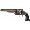 Manufactured from 1870 to 1872, this is a very early production Smith & Wesson No. 3, 1st Model American revolver with a low two digit serial number ("28") and is one of approximately 8,000 revolvers. The No. 3, 1st Model American revolver was manufactured with a standard 8 inch barrel with 6 inch and 7 inch barrels being less common. This example has a 7 inch barrel. The included factory letter confirms the 7 inch barrel, .44 S&W American caliber, blue finish and smooth walnut grips. The revolver was shipped to Smith & Wesson's largest distributor, M.W. Robinson of New York, City, as part of a 25 gun shipment on October 26, 1870. The revolver correctly has a vent hole (oil hole) in the rear extractor housing under barrel that was featured on the first 1,500 revolvers. The top of the barrel rib is stamped "SMITH & WESSON SPRINGFIELD MASS. U.S.A. PAT. JULY 10. 60. JAN. 17. FEB. 17. JULY 11. 65 & AUG. 24. 69" flanked by Maltese crosses. Pinned blade front and notch rear sights. The serial number is stamped on the butt with the assembly number "8A" stamped on the rear cylinder face, barrel latch and barrel. The right grip panel is numbered to the gun with the backs of both grips hand marked "PXM".