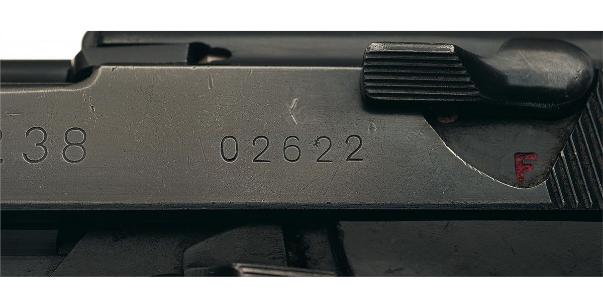 The left side of the slide is marked with the Walther banner followed by "P.38" and the serial number. The matching serial number is also found on the left side of the frame and front of the barrel lug. The right side of the slide is marked with two "Eagle/359" proofs flanking the Nazi firing proof. The left side of the slide also has what appears to be a Russian capture marking, the letter "X" above the serial number. The "Eagle/359" proof is repeated on the left side of the frame and most of the parts. The left side of the barrel lug is marked with the bore diameter "8,84". The checkered grips are stamped with the early military "480" code marking and single "Eagle/359" proofs. This 480 code was only used by Walther from mid 1940 through October 1940 and was rarely found on Zero Series pistols. The grips are also numbered to the gun. The magazine is numbered to the gun and has two "Eagle/359" proofs on the spine.