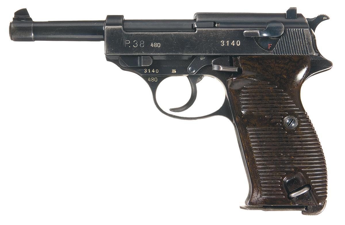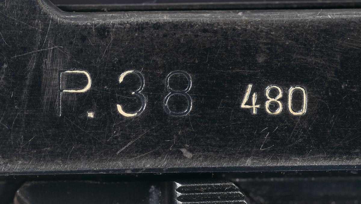 This is an example of a Walther P.38 pistol with "480" code markings. The 480 Code was produced in late 1940 and represented the first true military contract pistol with approximately 7,250 produced. This earlier production P.38 has the high polish blue finish, reddish brown ribbed Bakelite grips and rounded lanyard loop. The left side of the slide is marked "P.38", "480", followed by the serial number. The "480" code is also present on the left side of the trigger guard bow. The serial number is marked on the front of the barrel lug and the left side of the frame above the trigger guard bow. The lower left side of the magazine is marked "P 1 / 9mmx19". The right side of the slide is stamped with two "Eagle/359" Army acceptance marks on either side of a military "Eagle/Swastika" firing proof. "E/359" stamps are located on the right side of the barrel lug and locking block, the left side of the frame, on the takedown lever, slide hold back, on top of slide in front of the rear sight and on the hammer. The "Eagle/Swastika" proof is stamped on the left side of the locking block and "140" on the bottom. Almost all external markings are highlighted in white.
