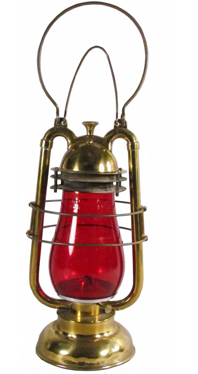 Rare Eclipse Brass Fire Lantern. Ruby glass globe. Fire Extinguisher Co. Chicago, ILL maker. Patent Sept 21, 1886. Missing filler cap, minor denting to top and base otherwise very good condition.