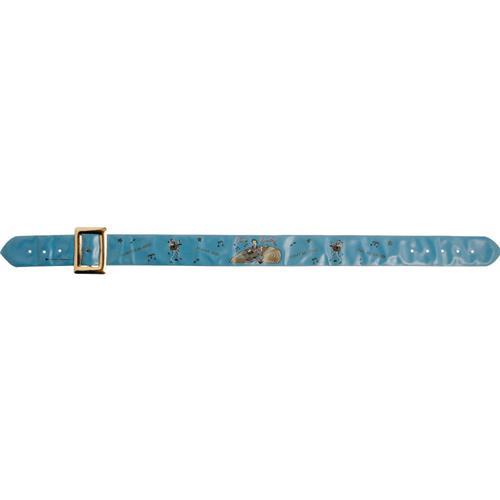 <B>Rare Elvis Presley Belt, Blue.</B></I> A blue vinyl belt adorned with a brass buckle and images of Presley and song titles, made circa 1956. In Excellent condition with mild wear.<BR><BR><b>Shipping:</b> Flat Material, Small (<a target="_blank" href="http://www.heritageauctions.com/common/shipping.php">view shipping information</a>) <BR><BR><B>Important notice:<