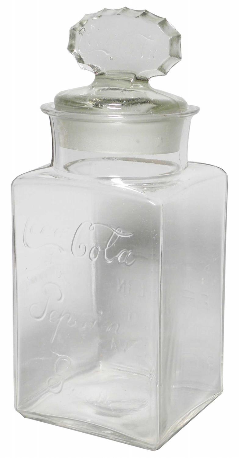 Rare Embossed Coca Cola Pepsin Gum Store Jar with original lid. Manufactured by Franklin Mfg. Co. Richmond, VA. S couple slight chips on ground glass lid and a few factory flaws in neck of jar otherwise excellent condition. 4 1`/2 inch square by 11 1/2 inches tall.
