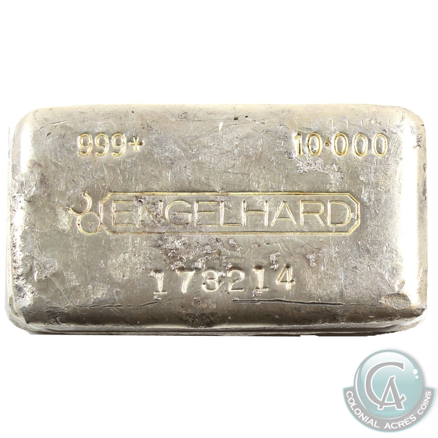 Rare Engelhard 10oz Fine Silver Bar Canadian Variation (TAX Exempt). Serial # 173214. This bar contains the dimensions of the 4th Series Canadian Production bars. Contains the center decimal on weight class as well as the dot in Bull logo.