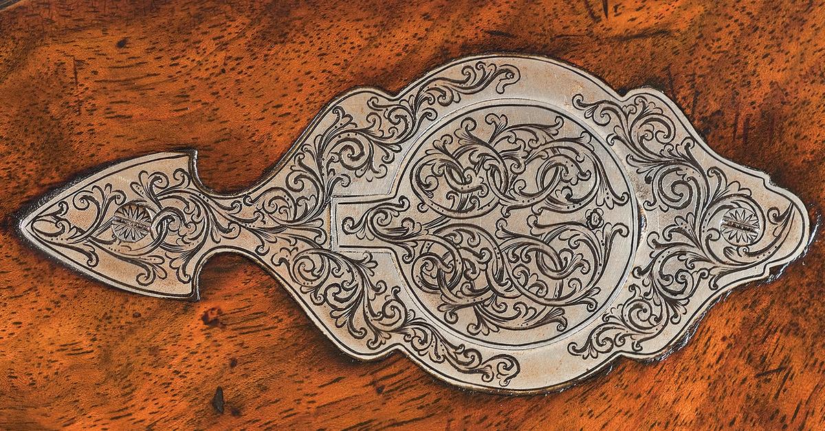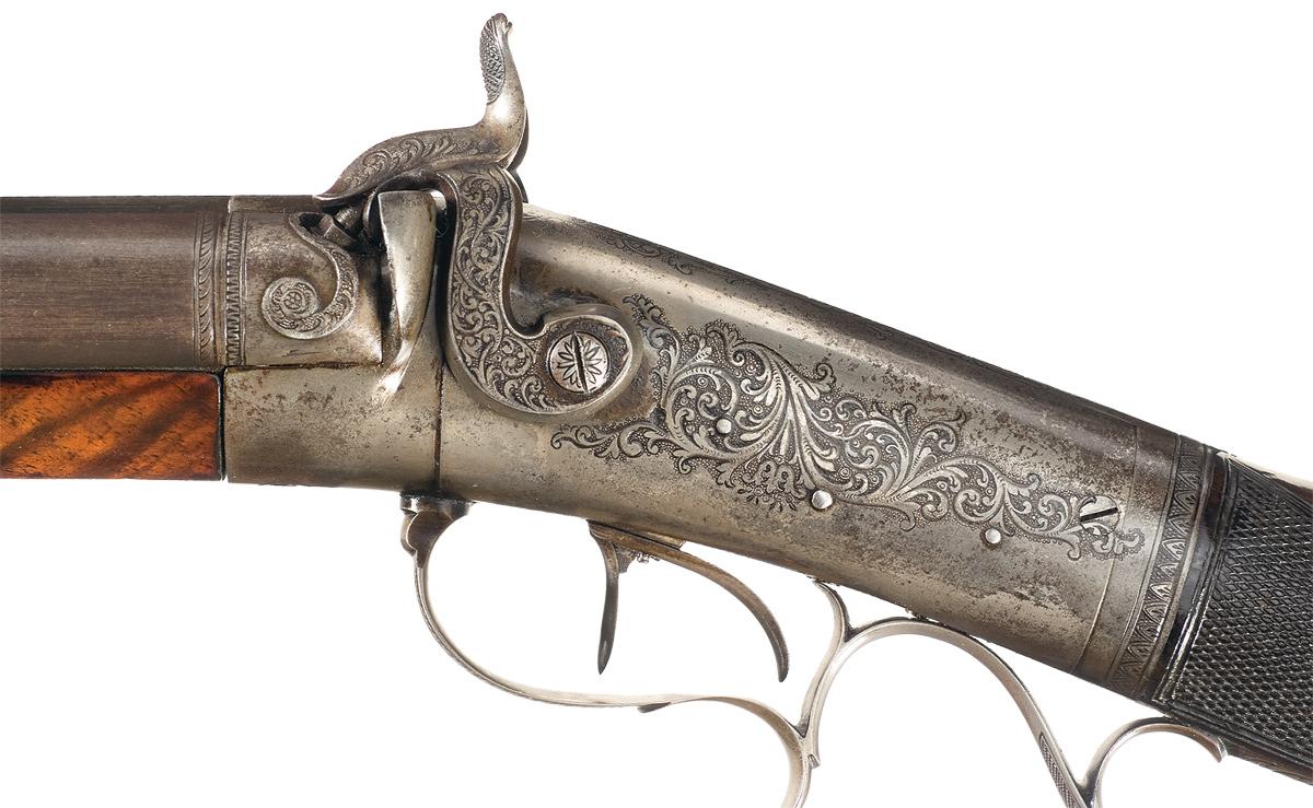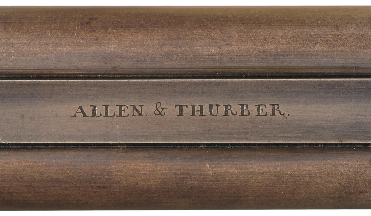 Manufactured circa 1840s into the early 1860s with production estimated at a few hundred of all configurations, with the double rifles not mentioned. This example of an Allen & Thurber double barrel muzzle loading rifle has a round barrel with a solid rib marked "ALLEN & THURBER.", a blade front sight, and a buckhorn rear sight. (Note that this type of rifle is usually found with octagonal barrels). An exquisite floral scroll engraving on a punch dot background is featured on the frame, hammers, forearm hardware, breech, Swiss style buttplate, oval buttstock overlay, and double spur trigger guard, with the scroll pattern extended to the patch box. The trigger guard also has fine checkering on the rear spur. Nicely figured checkered forearm and straight grip stock and adjustable triggers. While only a few hundred of this type of Allen rifle was produced, examples have been encountered with many variations and varying degrees of decoration. According to the consignor's notes, this rifle with the aforementioned characteristics was the only one known to the late firearms expert and author Frank Sellers.