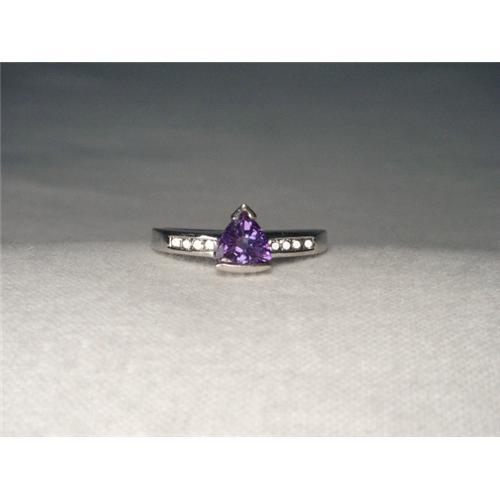 You are looking at a beautiful estate 14K white gold trillion tanzanite and diamond ring. This uniquely designed piece holds a natural trillion tanzanite, that weighs 40 points and 8 brilliant round diamonds that total 11 points. The ring weighs 2.1 grams. It is a size 6. Sizing is available. It is in mint condition.