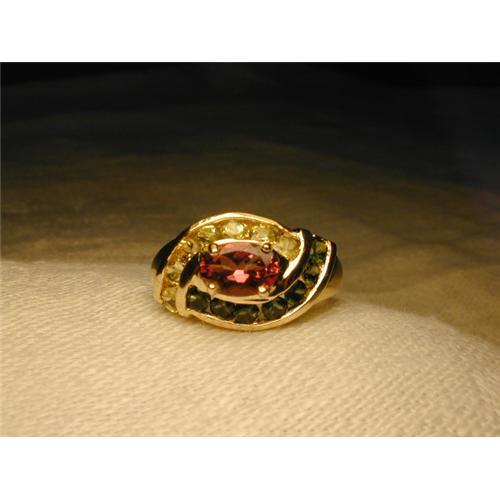 You are looking at a rare 14K yellow gold peridot, tourmaline and citrine ring. There are 7 peridots and 7 citrines, each measuring 3 mm in diameter. The natural pink tourmaline measures 7 mm by 5 mm. The top of the ring measures .75 of an inch across by .50 an inch wide. The ring is a size 6. Sizing is available. It weighs 3.3 grams. It is in mint condition.