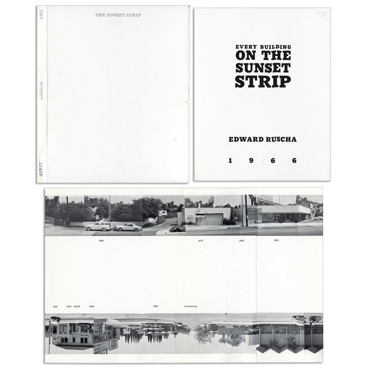 Rare first edition, second printing of Edward Ruscha's self-published photographic book ''Every Building on the Sunset Strip'': Los Angeles: 1966. This unique work features continuous photography of a two-and-a-half mile stretch of Sunset Boulevard, the same area that was the site of the Sunset Strip curfew riots in the summer of 1966. Book employs an accordion-style binding, with both sides of the street shown. Exact corresponding street numbers and names of cross streets accompany the images. A historical and artistically influential work. Softcover book without slipcase measures 5.75'' x 7.25''. Light soiling, creasing to the spine and $1.00 pencil notation to title page, else near fine.