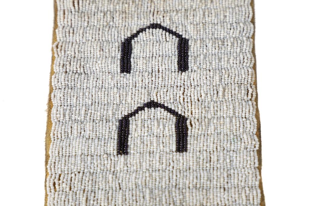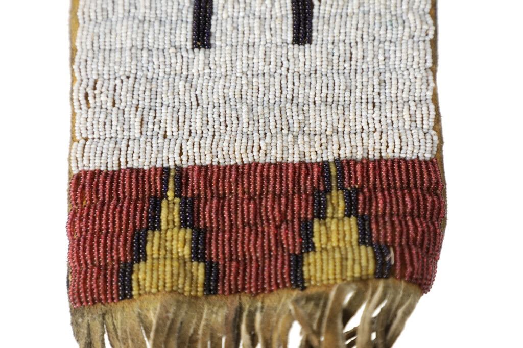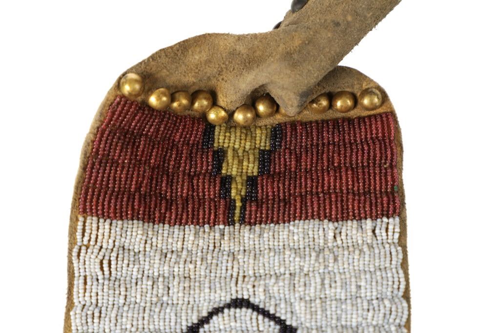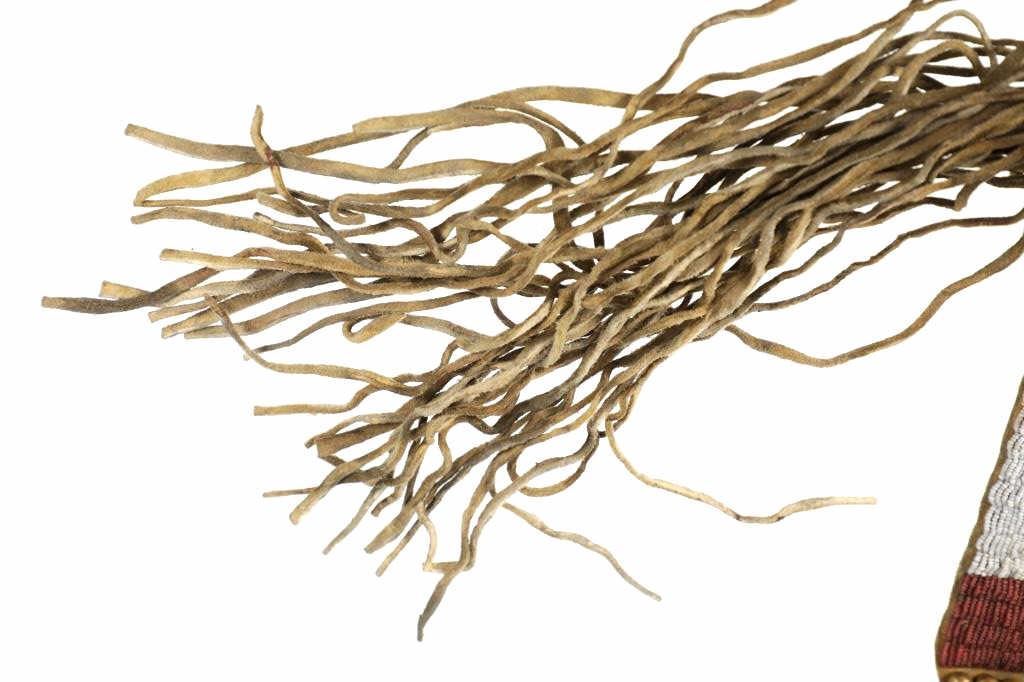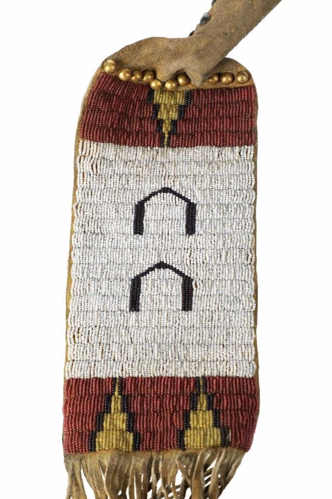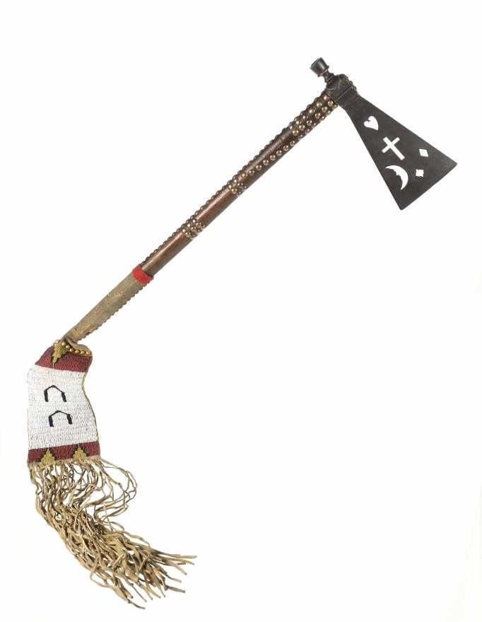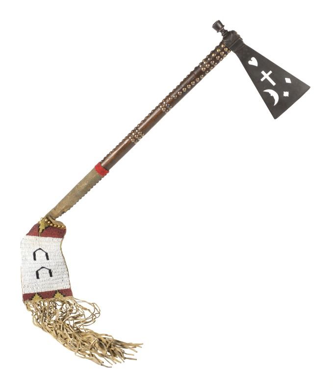This is a rare and exceptional pipe tomahawk with cutouts from the Cheyenne Native American Indian tribe dating to circa 1870’s Indian Wars era with beaded drop. This is likely one of the best early Indian Wars era tomahawk we have ever offered to the public market. This piece comes from the respected Mary Lou and Pierre DuPont family collection from St. Louis, Missouri and features a large, blacksmith hand-forged iron head with wide flaring Western pattern blade that has scarce and unique cutouts in the blade. There are small forged chevrons or “V”’s, forged moldings and a punch dot engraved decoration on both sides. The forged pipe bowl is short and wide in vase pattern and sits on a circular forged base. The head is secured to the haft with an old buckskin gasket, still present, and brass tacks. The clean out hole is visible at the top of the eyelet hole at the haft, the clean out plug is long missing. The haft is hardwood exhibiting an elaborately adornment of brass tacking on both sides and along the top edge. The blade shows five cut outs in the following shapes: an old-pattern weeping heart, a cross, a diamond, an old-pattern starburst, and a large half-moon with a face. This is one of only two or so known examples of these cutouts on a tomahawk blade in any museum or private collections. The other example is shown in the photo gallery of this lot for example and is in a museum collection in Alberta, Canada, being attributed to the Northern Cheyenne. Both pieces are likely from the same hand. The tomahawk has a beautiful beaded drop comprised of Buffalo Bison hide, a true piece of Native American art in and of itself. The drop is made of old Indian tanned Buffalo Bison hide and has artful beaded designs in typical Plains geometric and symbolic patterns done in all period correct 19th Century glass trade seed beads. The beadwork shows colors of greasy yellow, cobalt, semi-transparent rose, greasy chalk white, black. At the base of the tomahawk are long frilly fringes of Indian tanned hide with a yellow ocher mineral pigment coloring. The drop is sinew and trade thread sewn. There are 11 small brass buttons sewn on the top edge as well. The large beaded and fringed drop is reminiscent of the color pictured example on the opening page of the 1965 book by Harold Peterson “American Indian Tomahawks”. These more elaborately decorated examples of tomahawks were not just common pieces, but rather typically owned by Chiefs, Holy Men or other tribal dignitaries. This is truly a masterful work of antique Native American Art, being well kept and displaying beautifully. Provenance: From the DuPont family collection. Total length of the tomahawk is 25 ½ inches long with an additional 28 inch long beaded drop that is 5 inches wide.
