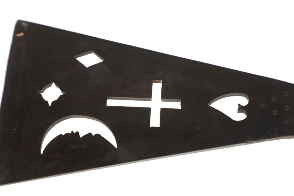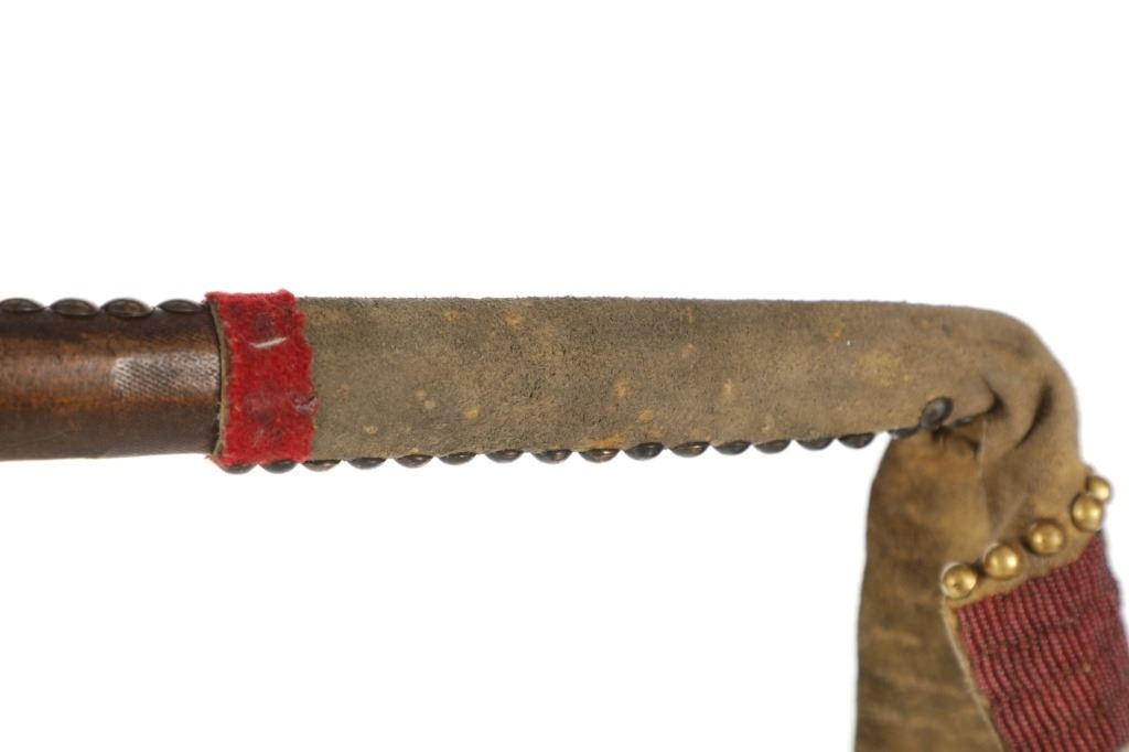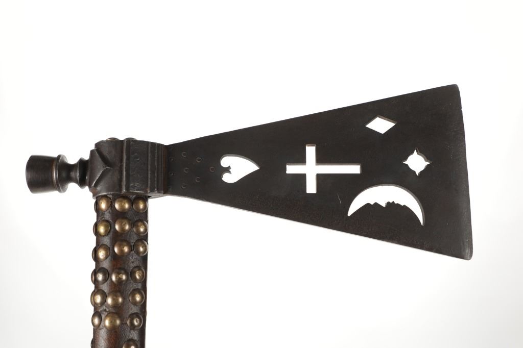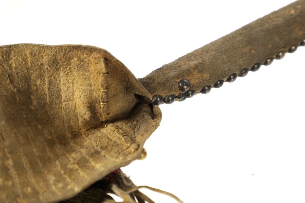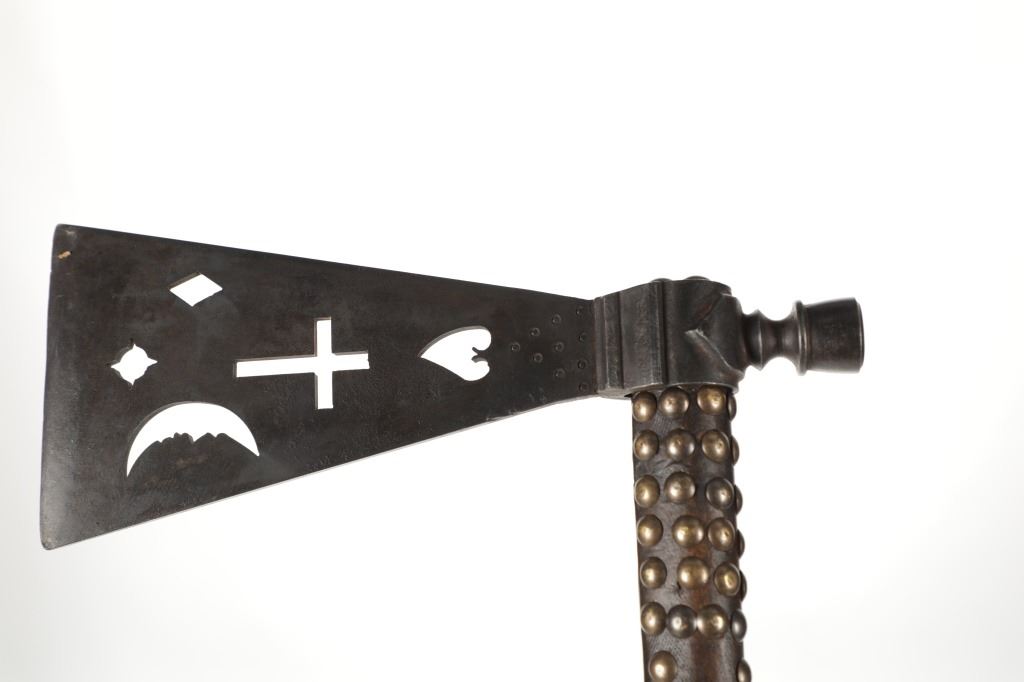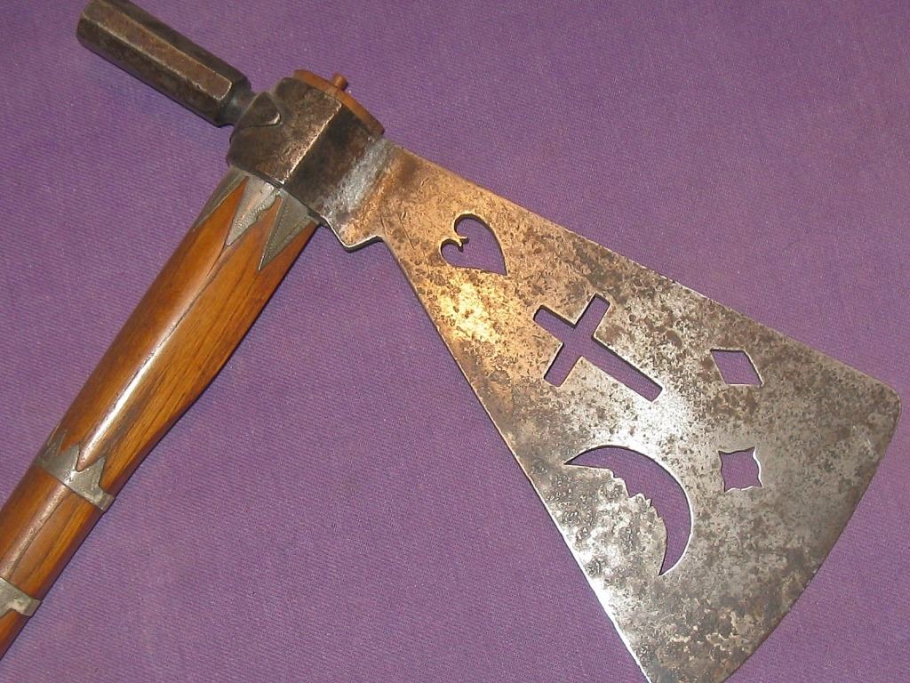 This is a rare and exceptional pipe tomahawk with cutouts from the Cheyenne Native American Indian tribe dating to circa 1870’s Indian Wars era with beaded drop. This is likely one of the best early Indian Wars era tomahawk we have ever offered to the public market. This piece comes from the respected Mary Lou and Pierre DuPont family collection from St. Louis, Missouri and features a large, blacksmith hand-forged iron head with wide flaring Western pattern blade that has scarce and unique cutouts in the blade. There are small forged chevrons or “V”’s, forged moldings and a punch dot engraved decoration on both sides. The forged pipe bowl is short and wide in vase pattern and sits on a circular forged base. The head is secured to the haft with an old buckskin gasket, still present, and brass tacks. The clean out hole is visible at the top of the eyelet hole at the haft, the clean out plug is long missing. The haft is hardwood exhibiting an elaborately adornment of brass tacking on both sides and along the top edge. The blade shows five cut outs in the following shapes: an old-pattern weeping heart, a cross, a diamond, an old-pattern starburst, and a large half-moon with a face. This is one of only two or so known examples of these cutouts on a tomahawk blade in any museum or private collections. The other example is shown in the photo gallery of this lot for example and is in a museum collection in Alberta, Canada, being attributed to the Northern Cheyenne. Both pieces are likely from the same hand. The tomahawk has a beautiful beaded drop comprised of Buffalo Bison hide, a true piece of Native American art in and of itself. The drop is made of old Indian tanned Buffalo Bison hide and has artful beaded designs in typical Plains geometric and symbolic patterns done in all period correct 19th Century glass trade seed beads. The beadwork shows colors of greasy yellow, cobalt, semi-transparent rose, greasy chalk white, black. At the base of the tomahawk are long frilly fringes of Indian tanned hide with a yellow ocher mineral pigment coloring. The drop is sinew and trade thread sewn. There are 11 small brass buttons sewn on the top edge as well. The large beaded and fringed drop is reminiscent of the color pictured example on the opening page of the 1965 book by Harold Peterson “American Indian Tomahawks”. These more elaborately decorated examples of tomahawks were not just common pieces, but rather typically owned by Chiefs, Holy Men or other tribal dignitaries. This is truly a masterful work of antique Native American Art, being well kept and displaying beautifully. Provenance: From the DuPont family collection. Total length of the tomahawk is 25 ½ inches long with an additional 28 inch long beaded drop that is 5 inches wide.