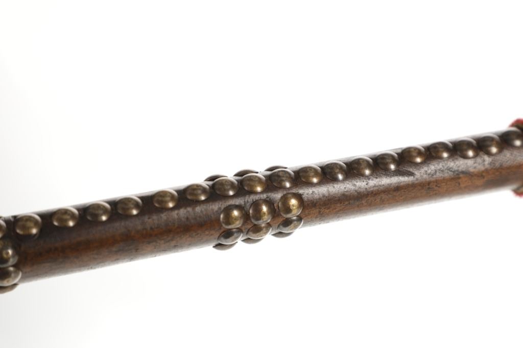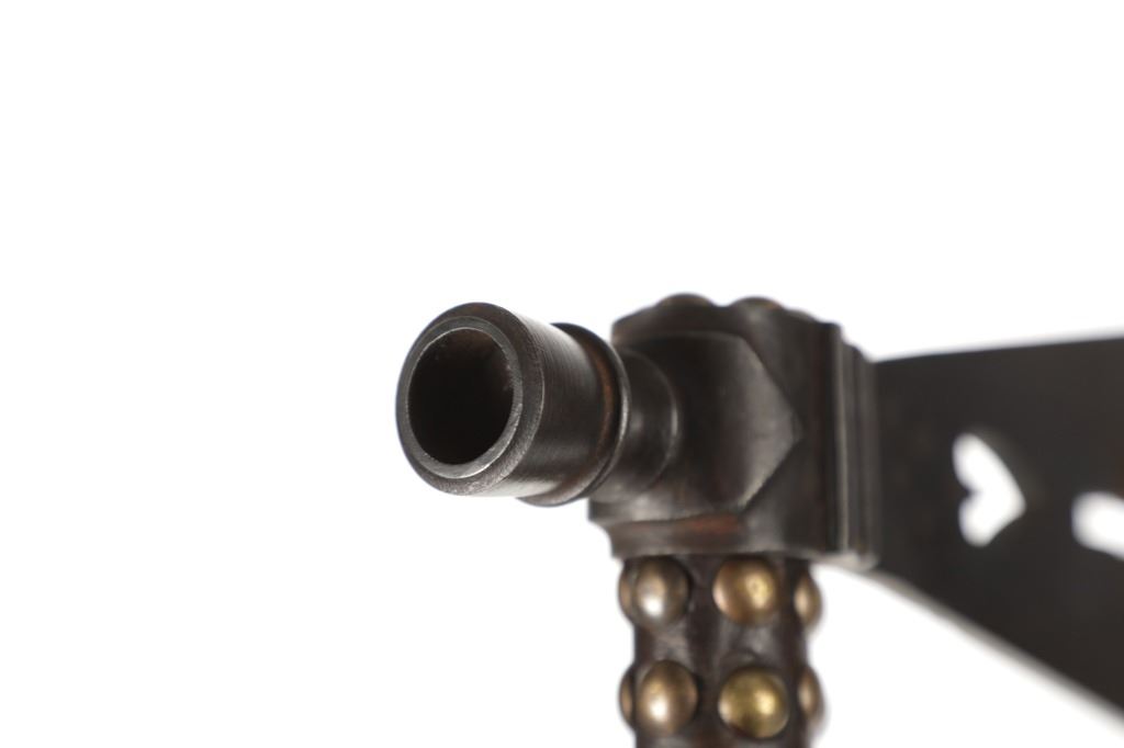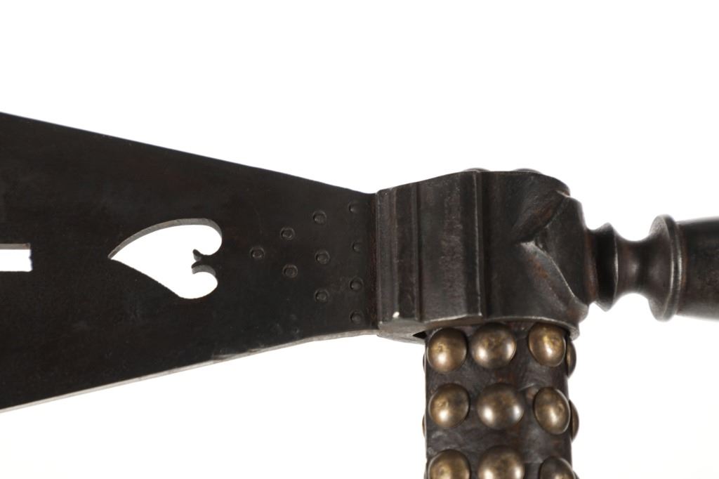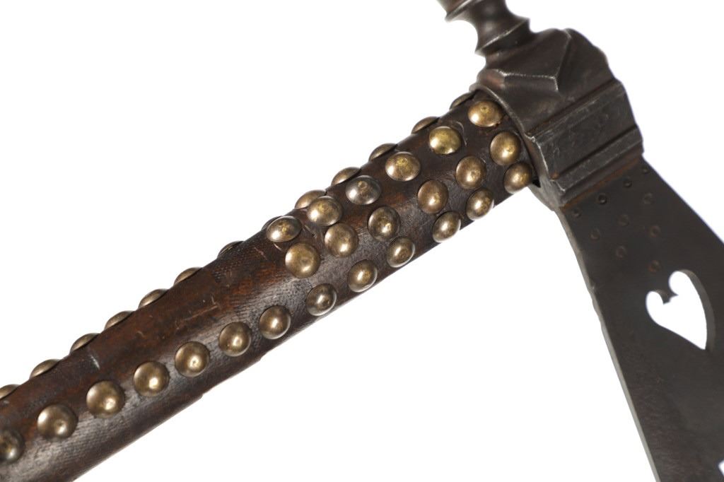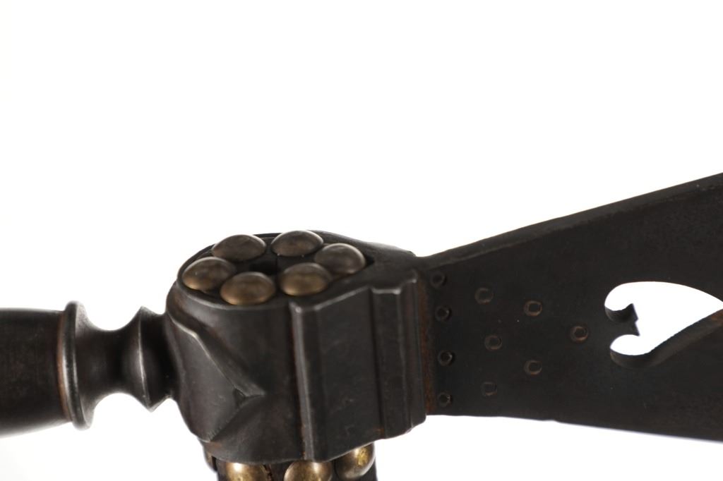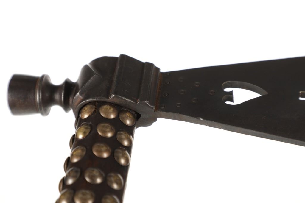 This is a rare and exceptional pipe tomahawk with cutouts from the Cheyenne Native American Indian tribe dating to circa 1870’s Indian Wars era with beaded drop. This is likely one of the best early Indian Wars era tomahawk we have ever offered to the public market. This piece comes from the respected Mary Lou and Pierre DuPont family collection from St. Louis, Missouri and features a large, blacksmith hand-forged iron head with wide flaring Western pattern blade that has scarce and unique cutouts in the blade. There are small forged chevrons or “V”’s, forged moldings and a punch dot engraved decoration on both sides. The forged pipe bowl is short and wide in vase pattern and sits on a circular forged base. The head is secured to the haft with an old buckskin gasket, still present, and brass tacks. The clean out hole is visible at the top of the eyelet hole at the haft, the clean out plug is long missing. The haft is hardwood exhibiting an elaborately adornment of brass tacking on both sides and along the top edge. The blade shows five cut outs in the following shapes: an old-pattern weeping heart, a cross, a diamond, an old-pattern starburst, and a large half-moon with a face. This is one of only two or so known examples of these cutouts on a tomahawk blade in any museum or private collections. The other example is shown in the photo gallery of this lot for example and is in a museum collection in Alberta, Canada, being attributed to the Northern Cheyenne. Both pieces are likely from the same hand. The tomahawk has a beautiful beaded drop comprised of Buffalo Bison hide, a true piece of Native American art in and of itself. The drop is made of old Indian tanned Buffalo Bison hide and has artful beaded designs in typical Plains geometric and symbolic patterns done in all period correct 19th Century glass trade seed beads. The beadwork shows colors of greasy yellow, cobalt, semi-transparent rose, greasy chalk white, black. At the base of the tomahawk are long frilly fringes of Indian tanned hide with a yellow ocher mineral pigment coloring. The drop is sinew and trade thread sewn. There are 11 small brass buttons sewn on the top edge as well. The large beaded and fringed drop is reminiscent of the color pictured example on the opening page of the 1965 book by Harold Peterson “American Indian Tomahawks”. These more elaborately decorated examples of tomahawks were not just common pieces, but rather typically owned by Chiefs, Holy Men or other tribal dignitaries. This is truly a masterful work of antique Native American Art, being well kept and displaying beautifully. Provenance: From the DuPont family collection. Total length of the tomahawk is 25 ½ inches long with an additional 28 inch long beaded drop that is 5 inches wide.