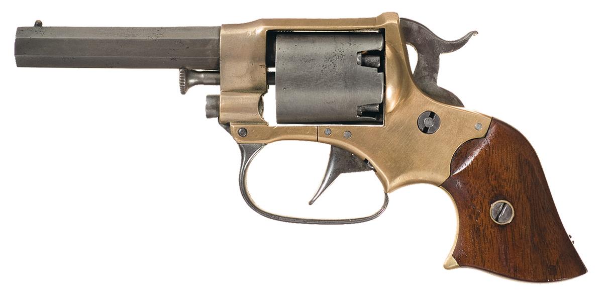 Condition: Fine, with a smooth dull gray patina and a few small areas of minor pitting on the barrel and cylinder. The brass has been cleaned some time ago and has again taken on a pleasant mellow aged patina. Fine grips, with a few light scratches and handling marks. Mechanically fine.
