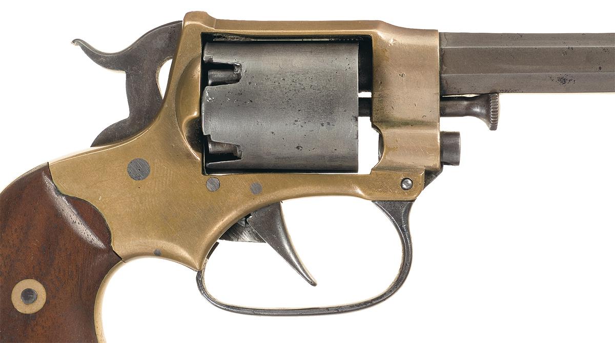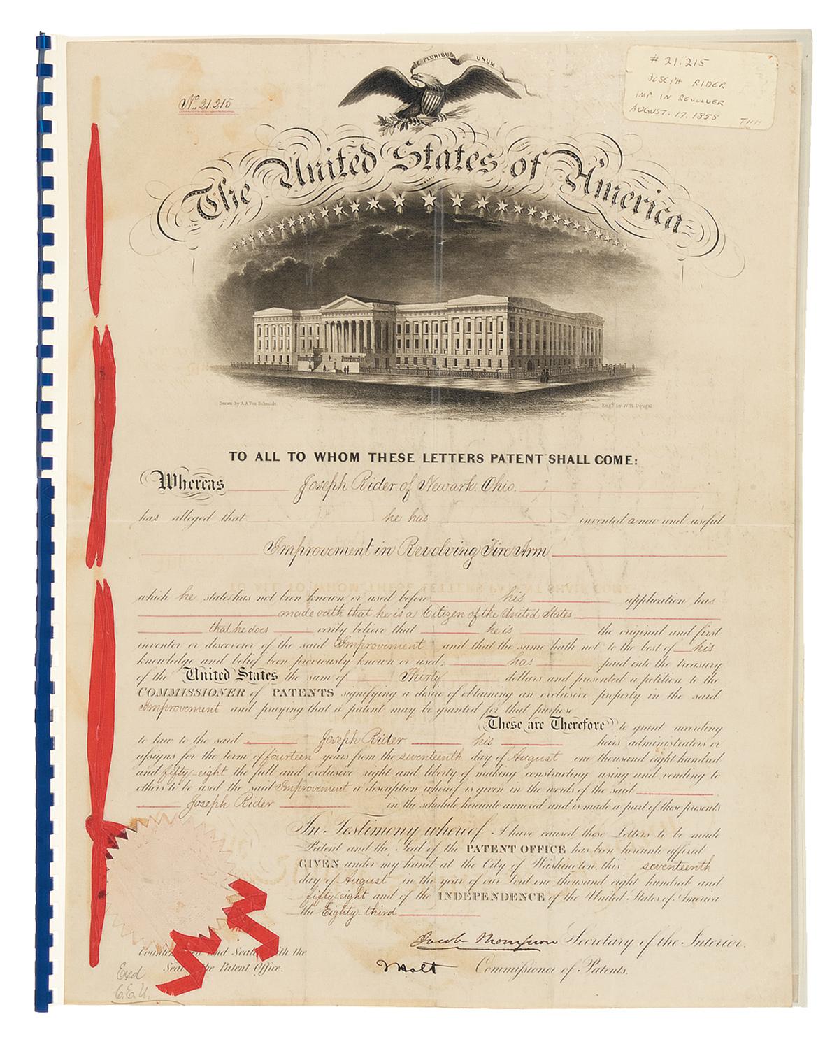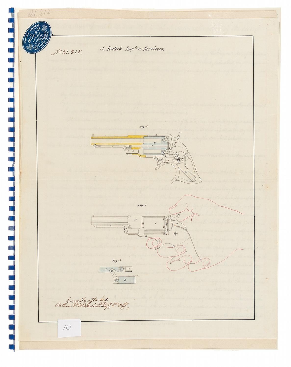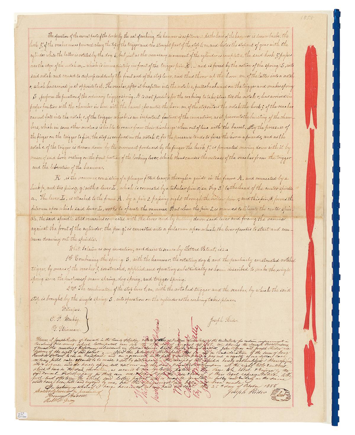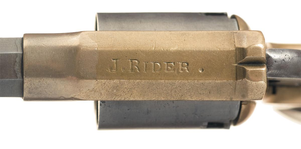 Produced circa 1858, this Rider Experimental revolver is equipped with a unique trigger guard loading lever. The plunger is housed in the lower frame and is attached to the upper front of the trigger guard, and the rear of the trigger guard latches into the frame directly behind the trigger, when pushed forward, the trigger guard unhooks and can swing down to work the plunger. The top strap is marked "J. RIDER." and there are no other visible markings. Brass cone front and frame notch rear sights, brass frame and metal parts appear to have been left in the "white". The revolver functions in both single and double action. Fitted with smooth two piece walnut grips. The revolver is accompanied by the original three page patent papers for the Rider Revolver, which have been laminated for preservation, and a copy of a notarized letter stating that the revolver was from the William M. Locke collection and is pictured in Antique Armory's, "THE WILLIAM M. LOCKE COLLECTION" on page 339.