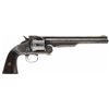 This is a rare experimental Model 3 American revolver chambered for 44-100 caliber. In the factory letter Smith & Wesson historian Roy Jinks states that the factory records only show that this revolver was manufactured in June 1870, and he concludes, "Since it is not a standard caliber for this model and more an experimental gun, there may not be any additional information." As confirmed by Jinks, it is known that a two digit serial number revolver was shipped to Wexel & DeGress of New York City on August 16, 1870 with 200 44-100 cartridges. The top of the barrel rib is stamped "+SMITH & WESSON SPRINGFIELD MASS. U.S.A. PAT. JULY 10. 60. JAN. 17. FEB. 17 JULY 11. 65 & AUG. 24. 69+". The vent hole (oil hole) is located on the rear extractor housing under the barrel, a feature that was only on the first 1,500 revolvers. The trigger has been modified to a more curvature configuration as compared to standard models. The barrel catch is hand checkered. Pinned German silver blade front sight with notch rear sight on the barrel latch. The assembly number "A6" is stamped on the rear face of the cylinder, barrel latch and barrel with the low two digit serial number stamped on the butt. The revolver is fitted with smooth walnut grips. The right panel is numbered to the gun ("14") while the left panel is stamped with the number "15".