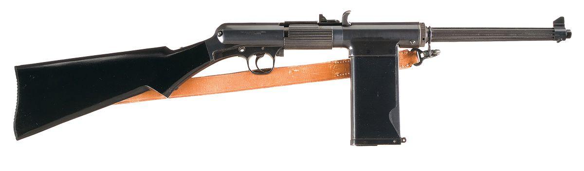 This is an improved version to the Mark I light weight rifle that was originally produced for the British government during WWII and which became a limited candidate against the M1 carbine during test trials. Due to the general instability of this design and a flaw in the actual trigger mechanism that allowed the weapon to accidentally discharge when dropped, this model failed in the test trials against the M1 Carbine. Very few were ever actually produced to begin with and most were destroyed, with only about 80 remaining in the U.S., they are considered a very rare S&W light rifle. The action operates from an open bolt, with the cocking knob on the right side and they are fitted with a unique wide magazine housing which serves a dual purpose; the front section holds the actual magazine and the rear portion is actually the ejection port. So that when the rifle is fired, the spent cartridges are ejected directly down to the ground instead of into the air. It is fitted with a fixed blade front sight with a fixed blade rear sight that is adjustable for elevation only. The basic differences between the original Mark I and this model the Mark II, is that the safety lever, cam and set screw above the trigger were removed on the Mark II and replaced with a large serrated rotating safety ring that is located around the center section of the receiver directly behind the rear sight. A new patent number was also added on the right rear side of the receiver housing . The basic other features and markings remain the same. The rifle is fitted with a black plastic or composite pistol grip stock with a serrated metal butt plate. Due to the original design issues with these rifle and the potential for an accidental discharge, it is recommended that these rifles "NOT BE LOADED OR FIRED IN ANY MANNER."