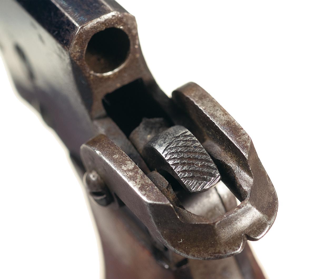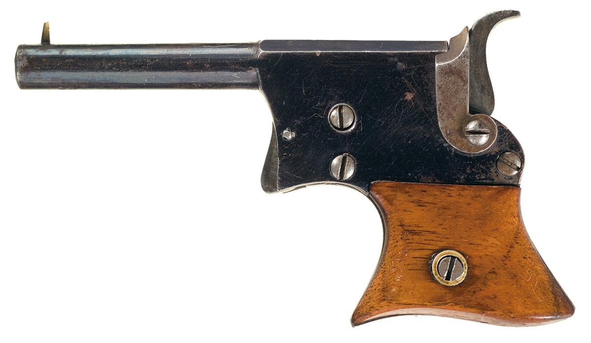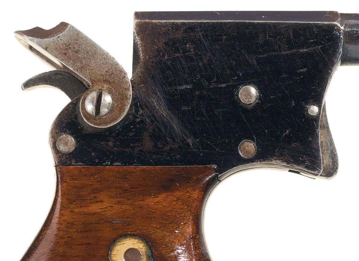 Similar in design to the Remington Number One Vest Pocket Pistol, with a longer barrel, taller post front sight, rounded frame at the rear and a breechblock with a notched rear sight attached exteriorly to the frame. There are no visible maker marking or serial number. Fitted with smooth walnut grips. Consignor states that this pistol may be a Remington patent or experimental model.