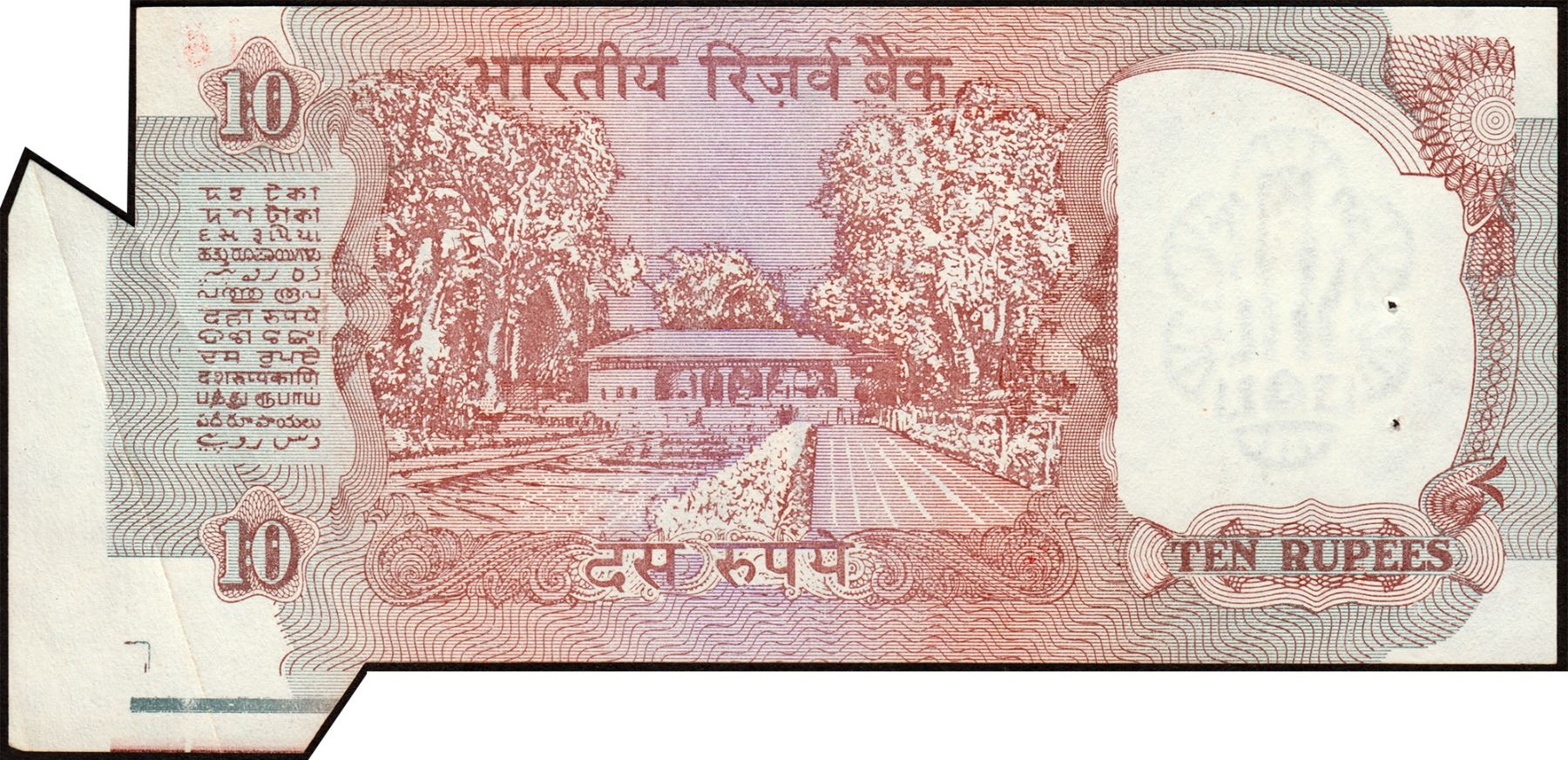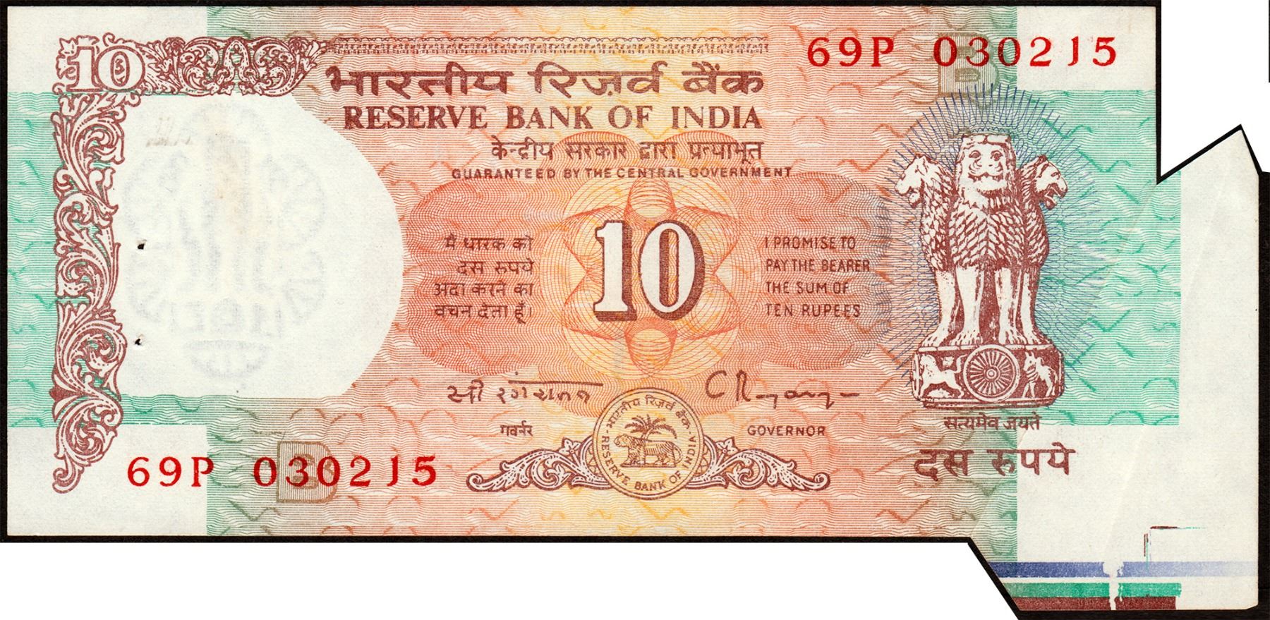 Republic India, 1992-1997, Error 10 Rupees, Signed by C. Rangarajan, Error: Extra paper & sheet fold cutting error, 20% extra paper at the bottom right, the extra paper shows sheet margin, B Inset, P Prefix, S. No. 69P 030215, staple holes, folds, minor stains, AU-UNC, Rare.