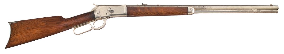 Condition: Very fine. The rifle retains 70% of the original nickel-plated finish. There is light-moderate finish wear with some scattered flaking on the barrel, magazine and forearm cap. Wear on the receiver, hammer and lever is limited to some finish loss on the edges and some minor, scattered, flaking and spotting. The crescent buttplate retains about 30% of the nickel-plated finish and has scattered age spotting. The barrel and receiver markings are sharp. The walnut stock and forearm are both in fine overall condition with some minor handling marks. This is a fine example of a Winchester Model 1892 Sporting Rifle with rarely encountered, factory, nickel-plated finish.