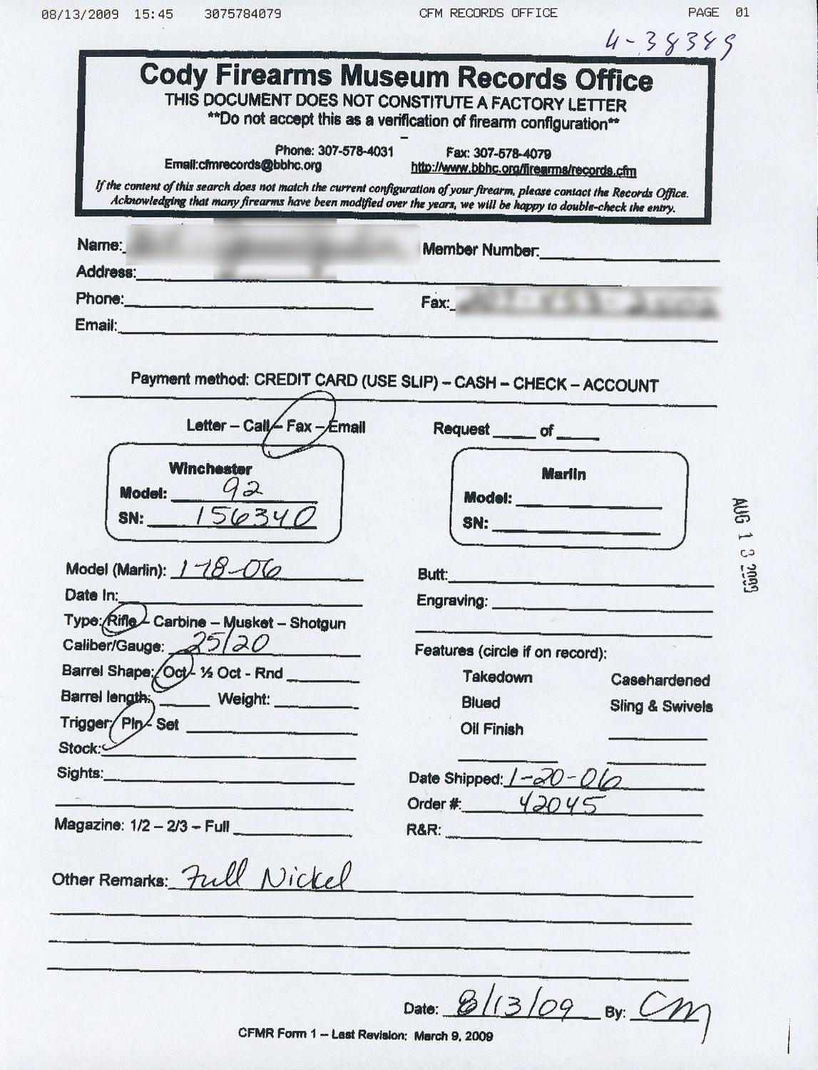 This rare nickel finish Winchester Model 1892 Lever Action Rifle was manufactured in 1906. The rifle has a rare, special order, full nickel-plated finish with varnished walnut stock and forearm. Accompanying the rifle is a Cody Firearm Museum Fact Sheet. The Fact Sheet states that this rifle was shipped from the Winchester warehouse on January 20, 1906. The Fact Sheet describes the rifle as having a nickel finish, caliber 25-20 full octagon barrel and plain trigger. The rifle has a full octagon barrel with full-length magazine. The barrel has a front sight with nickel-silver blade and a sporting style rear sight. The top of the barrel is roll-stamped with the two-line legend: "MANUFACTURED BY THE WINCHESTER REPEATING ARMS CO./NEW HAVEN.CONN.U.S.A.PATENTED OCTOBER 14. 1884." ahead of the rear sight. The top of the barrel is marked with the caliber designation "25-20 W.C.F." behind the rear sight. Oval Winchester "W/P" proofmarks are stamped on the top of the barrel and the receiver. The upper receiver tang is roll-stamped: "MODEL 1892 - WINCHESTER- / PAT. OCT. 14. 1884" in three lines. The serial number, "156340" is marked on the forward edge of the lower receiver.