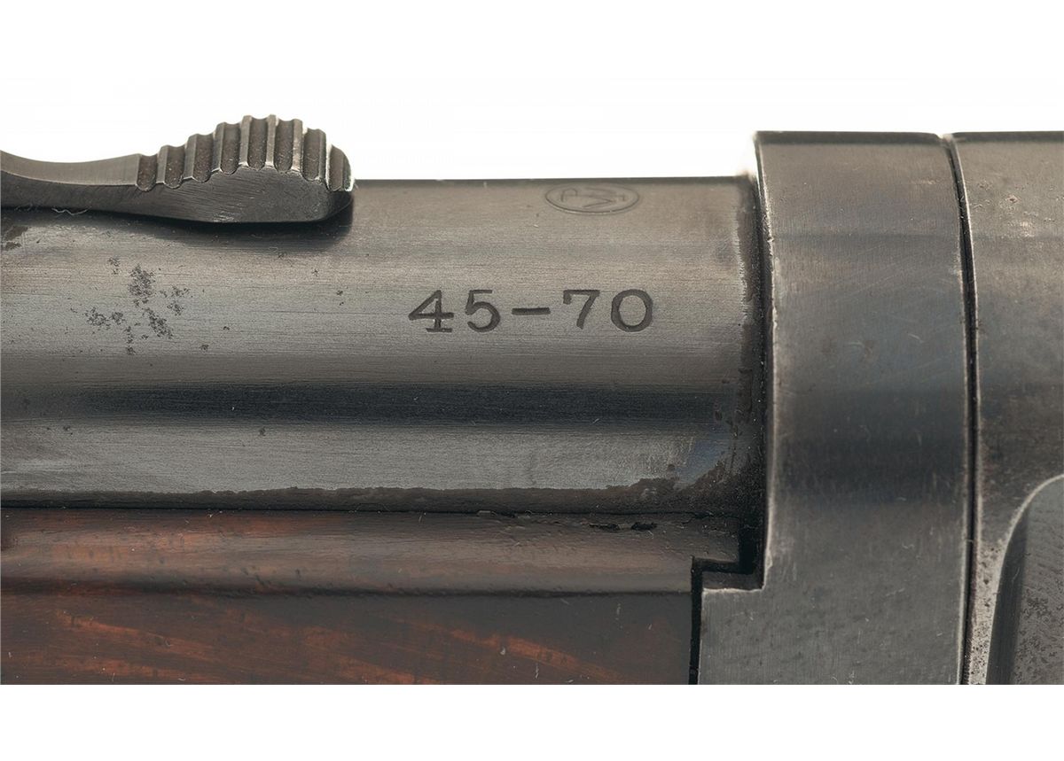 Winchester Model 1886 Extra Light-Weight Takedown Rifle chambered for the .33 W.C.F. cartridge with extra special order .45-70 light-weight barrel, magazine and forearm. The rifle is accompanied by a Cody Firearms Museum letter that describes it as: "33 caliber", with round barrel, plain trigger, checkered stock with pistol grip, Lyman leaf and combination rear sight with cup disc, full magazine, shotgun butt with rubber buttplate and "Takedown". The letter describes the extra barrel as: "45/70, 22 inch round barrel, full magazine, extra light weight, fancy checkered forearm, Lyman leaf sight, nickel steel barrel, Winchester high velocity". The letter states this rifle was shipped from the Winchester warehouse on July 28, 1909. The rifle has a blue barrel, magazine, forearm cap and receiver. The hammer and lever are color casehardened. The forearm and pistol grip stock are special order fancy grain walnut with Style H checkering and high polish oiled finish. The stock has a black hard rubber pistol grip cap relief embossed "WINCHESTER REPEATING ARMS CO." and a black hard rubber checkered shotgun buttplate with the round Winchester logo embossed in the center. The barrel has a Lyman Hunting front sight with colored insert and a sporting rear sight with adjustable insert and serrated edges. A Lyman folding combination rear sight with cup disc is mounted on the receiver tang. The top of the barrel is roll-stamped "MANUFACTURED BY THE/-WINCHESTER REPEATING ARMS CO. NEW HAVEN. CONN. U.S.A-" above the single line 1884 and 1885 patent dates. "NICKEL STEEL BARREL/ESPECIALLY FOR SMOKELESS POWDER" is stamped in two lines on the left side of the barrel below the rear sight. The caliber designation, "33 W.C.F.", is stamped on the top of the barrel between the rear sight and the takedown collar. The 22-inch light-weight .45-70 barrel and magazine have the same Winchester blue finish and highly figured piano finished fancy grain walnut forearm with Style H checkering as the .33 W.C.F. barrel. The barrel has a low profile Winchester sporting rear sight and a Lyman Hunting front sight with replacement Redfield blade. The top of the barrel is roll-stamped "MANUFACTURED BY THE WINCHESTER REPEATING ARMS CO./NEW HAVEN CONN. U.S.A. PAT. OCT. 14. 1884.JAN. 20.1885." in two lines ahead of the rear sight. "NICKEL STEEL" is stamped on the left side of the barrel below the rear sight followed by the caliber designation "45-70". Oval Winchester "W/P" proof marks are stamped on the top of both barrels and the receiver. The 1884 and 1885 patent dates and the serial number "145578" are stamped on the lower tang.