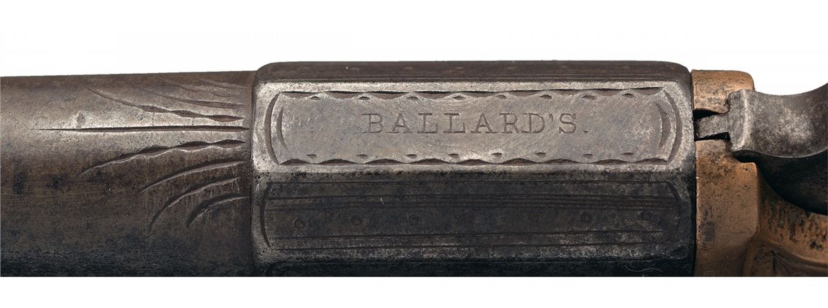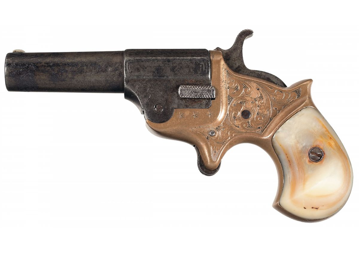 Manufactered circa 1870 this is a rare factory engraved Ballard derringer. The brass frame has a scroll and punch dot engraving on the sides along with three attractive stars. The breech end of the barrel has light engraved accents. The top barrel flat is marked "BALLARD'S" with the left barrel flat marked with the address/patent date marking. Barrel is numbered to gun. Fitted with smooth bird head pearl grips.