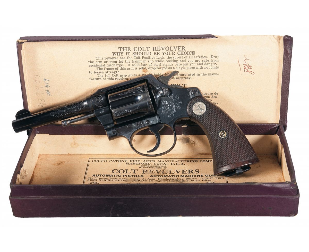 The included Colt factory letter confirms the caliber, blue finish, class "A" factory engraving and lanyard swivel with type of stocks not listed and a 5 inch barrel at time of shipment. The revolver was sold to Griffin & How, New York and shipped to Abercrombie & Fitch, New York on March 11, 1940 on order number 8925 as a single gun shipment. This revolver is engraved with approximately 25% coverage of open vine scroll without punch dot. The rear sides of the barrel, cylinder flats, frame, top strap, backstrap, butt and trigger guard all have flourishes of the open vine scroll engraving. In addition the revolver features the standard barrel markings and is fitted with checkered walnut grips with silver medallions and a lanyard swivel on the butt. Deep checkering has been cut into the hammer, trigger and grip straps. With a non-matching maroon Colt box and most of the blue label.