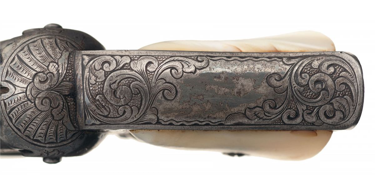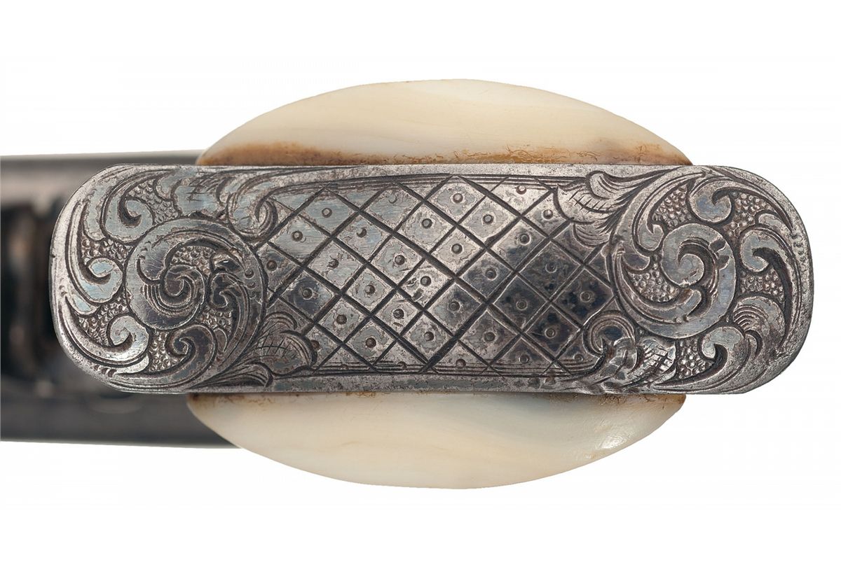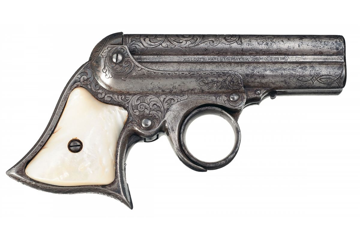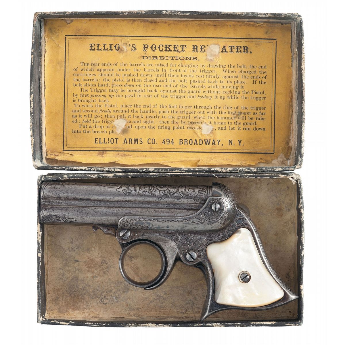 Manufactured circa 1863 to 1888, this derringer features factory scroll and punch dot engraving on the top barrels, frame sides and back strap. There is a simple line design on the muzzles, a shell design on the upper rear of the frame and a geometric design on the butt. The left side barrel rib is marked "MANUFACTURED BY E. REMINGTON & SONS ILION N.Y." and "ELLIOT'S PATENTS, MAY 29, 1860 OCT 11 1861" on the right rib. The matching serial number is marked on the frame under the barrels and on the bottom of the barrel group. The derringer was silver plated and is fitted with smooth pearl grips. Complete with two piece black box with the "Elliot's Pocket Repeater" directions label on the inside of the lid.