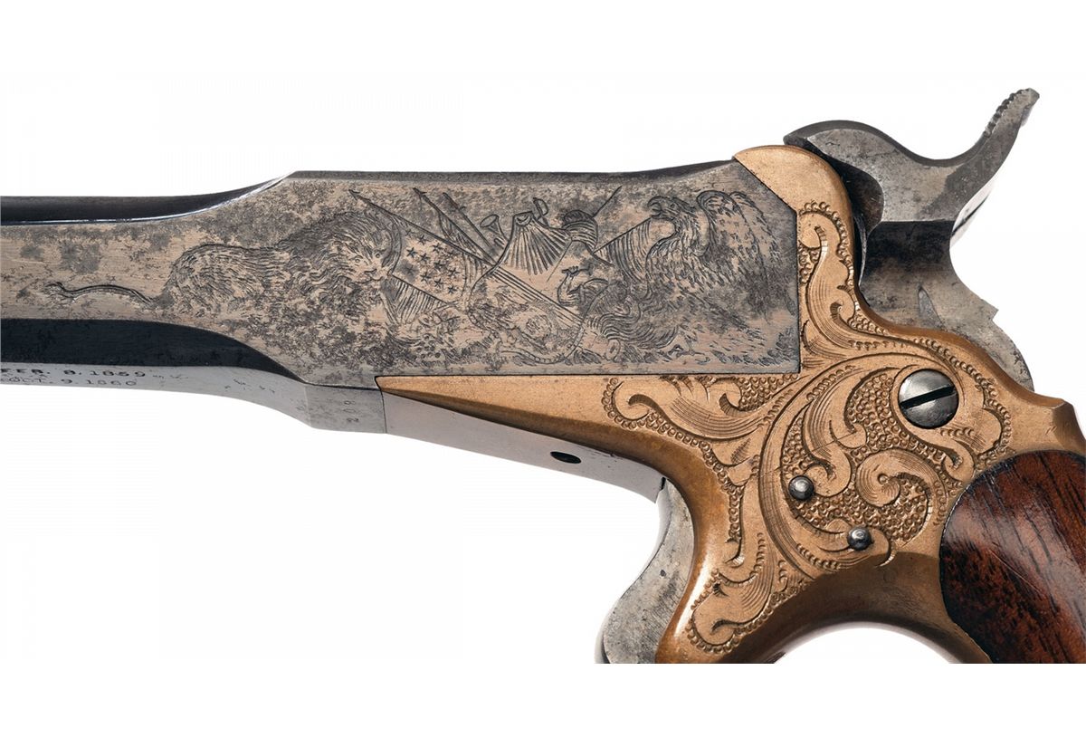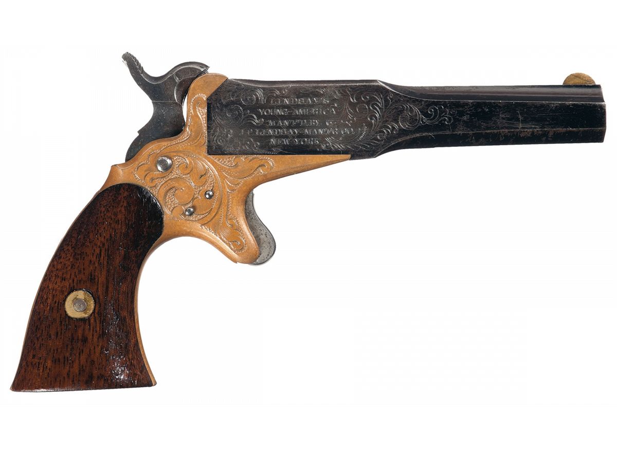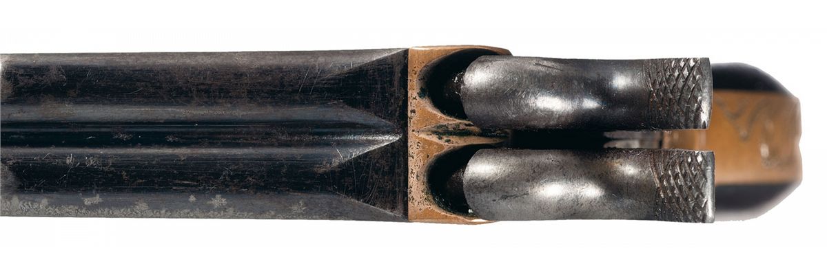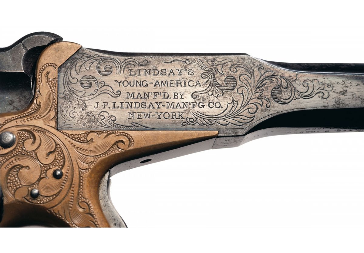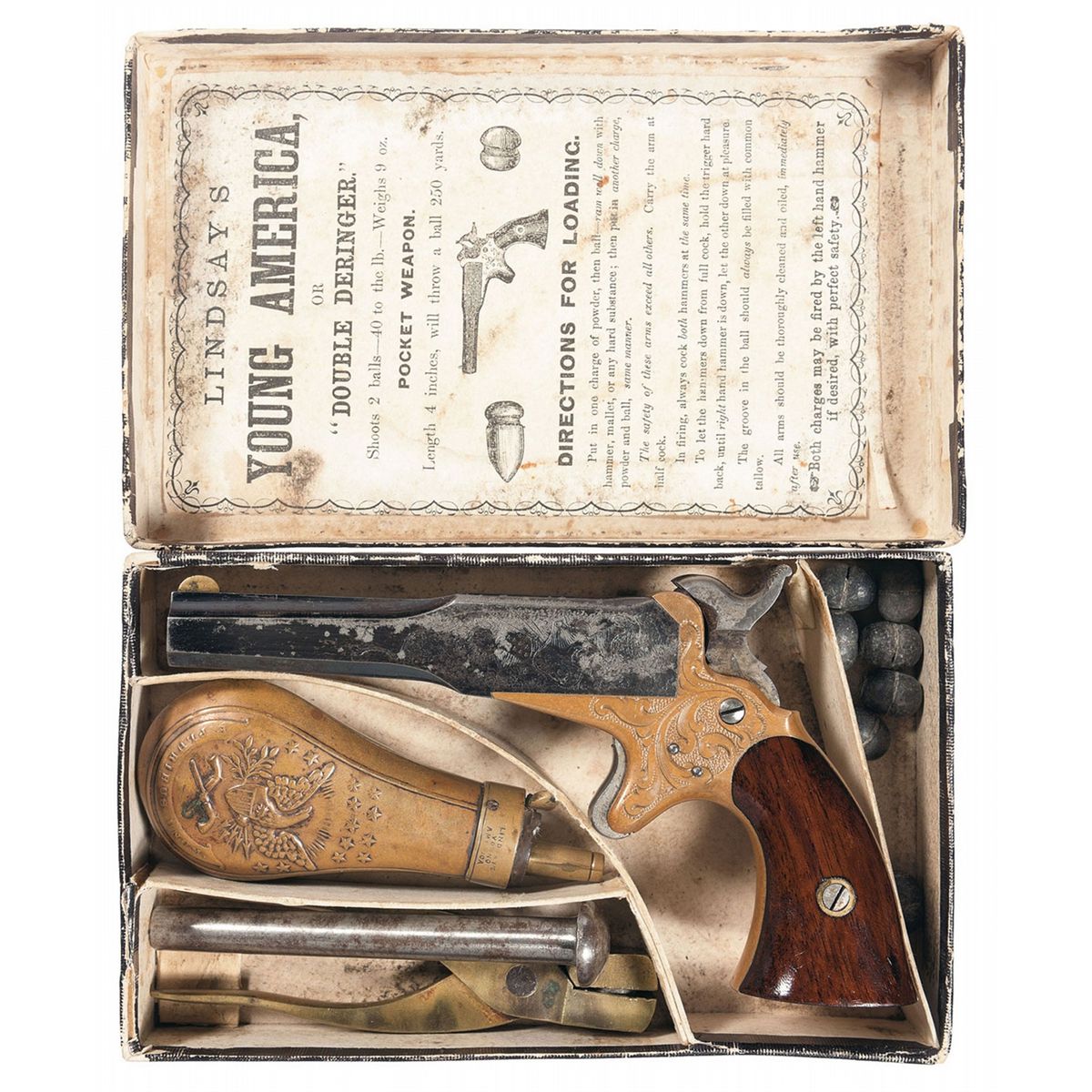 This rare and unusual pistol was invented by John P. Lindsay and manufactured in the early 1860s in extremely limited quantities with only several hundred produced. The pistol has a single barrel that holds two superposed loads. The pistol has two hammers and one trigger enabling the user to fire each charge separately. The barrel is a full octagon with a stepped down contour with wide flat sides at the breech end half and contoured rounded top with a sighting groove. The right rear of the barrel is marked "LINDSAY'S/YOUNG-AMERICAN/MAN'F'D BY/J.P. LINDSAY-MAN'FG CO./NEW-YORK" and features a scroll engraving. The left rear of the barrel is engraved with a flag and shield motif flanked by a large lion and eagle. The bottom barrel flat is marked "PATENT'D. FEB. 8. 1859/PATENT'D. OCT. 9. 1860" and the serial number "208" is marked just ahead of the frame. The brass frame features a scroll and punch dot engraving on the sides and back strap. The serial number is also on the frame under the grips and on the back of both grips. Fitted with smooth two piece grips on a square butt. Complete with its original box with correct label on the inside of the lid, a double face eagle powder flask marked "LINDSAY'S/YOUNG/AMERICA", an iron ramrod and a single cavity brass bullet mold.