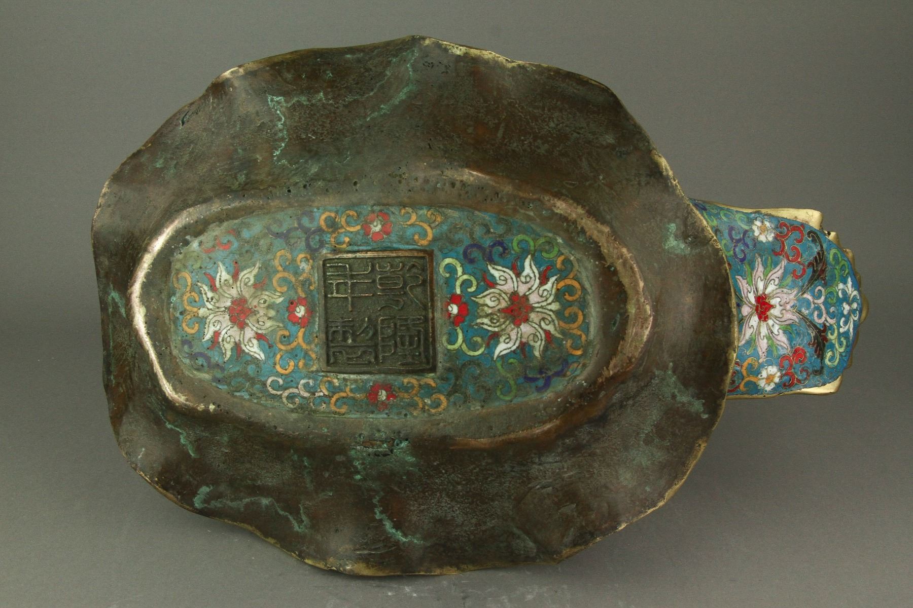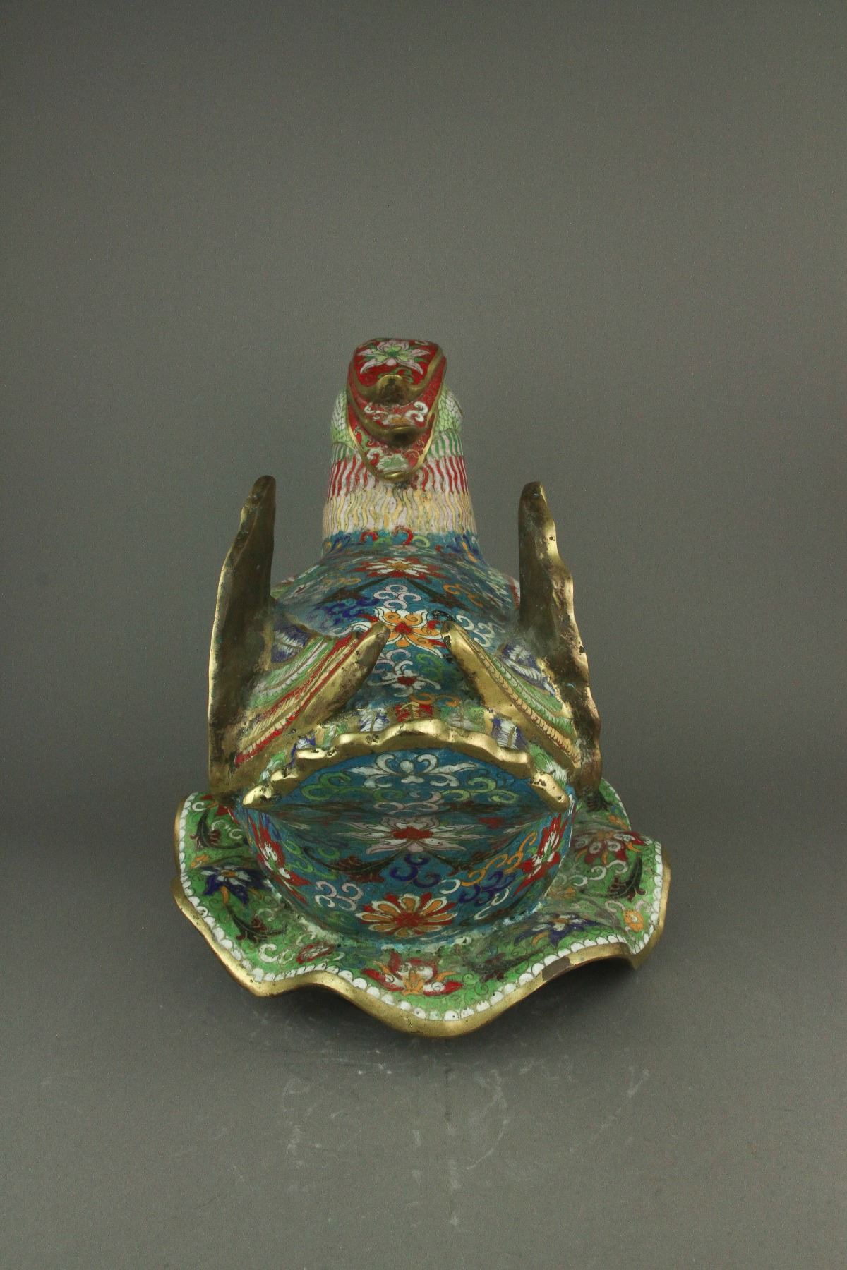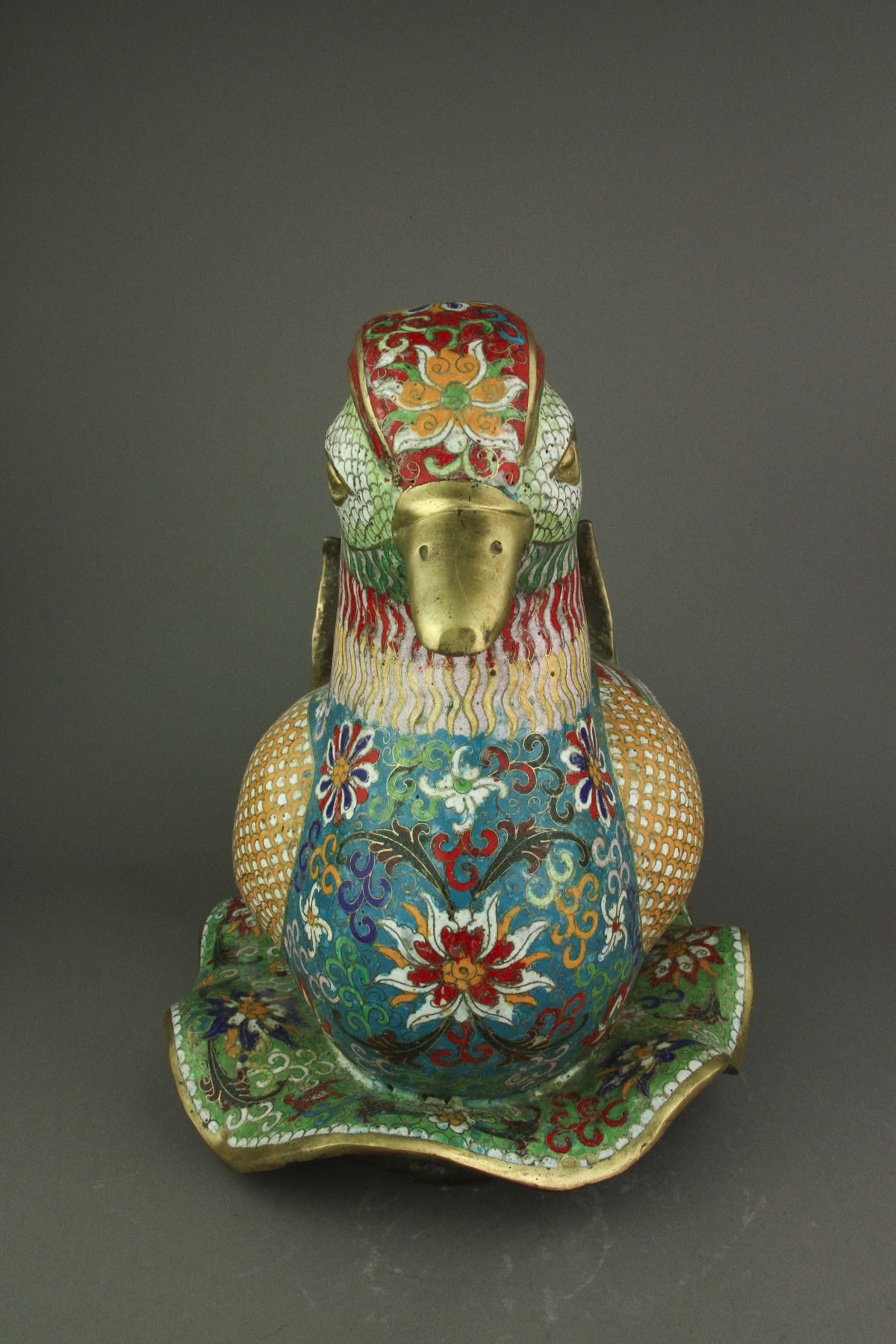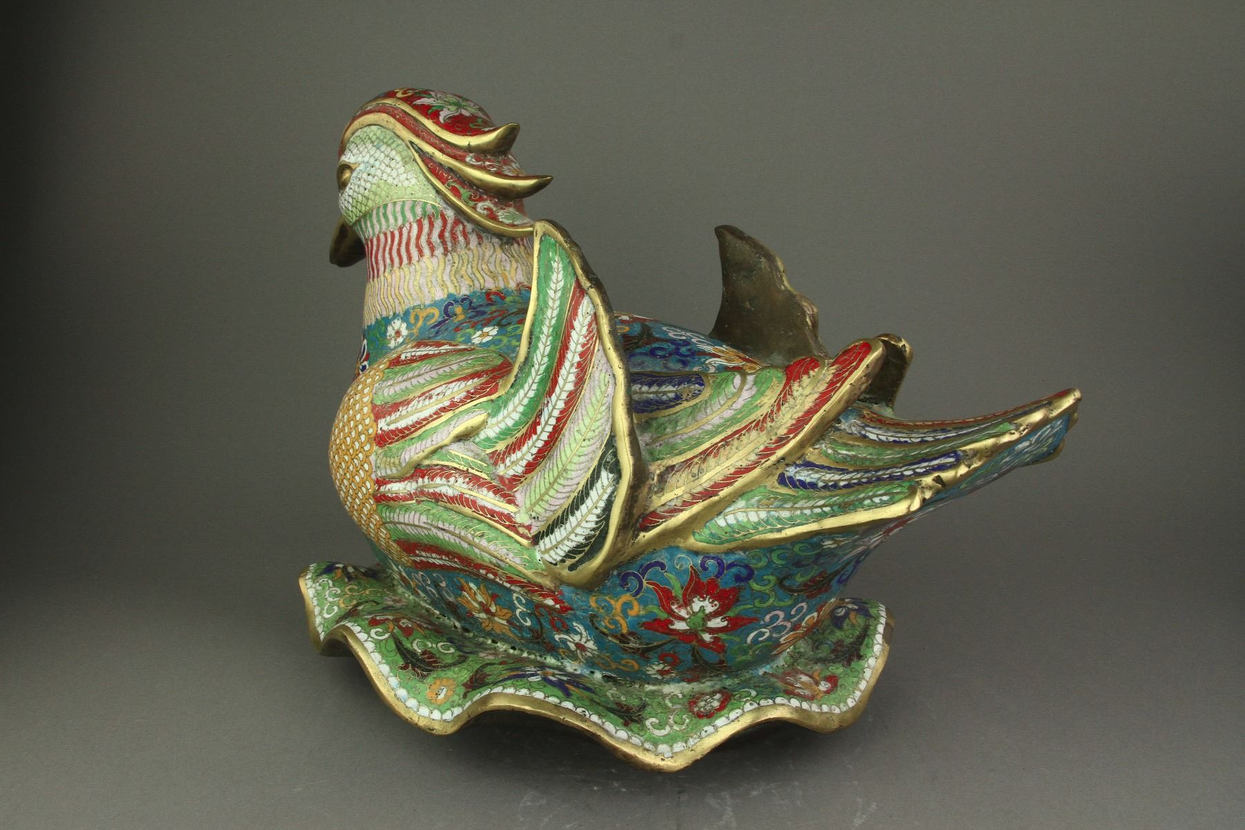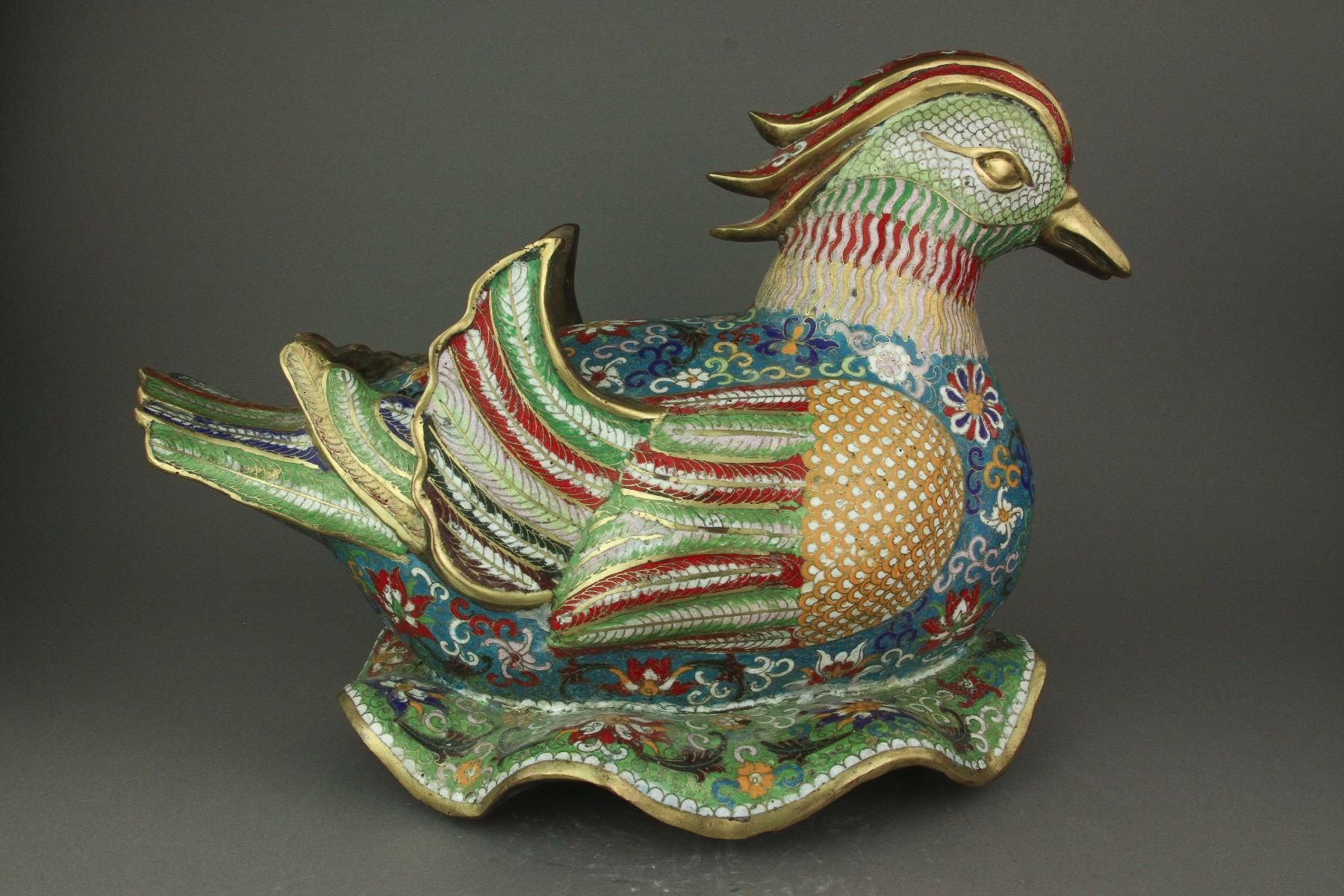 Chinese rare cloisonne bronze figure; Qing period; depicting a swimming mandarin duck; the body richly decorated with floral scrollwork and feather-like patterns; four-character Qianlong mark on base; H: 34 cm, L: 44cm, 13 kilograms