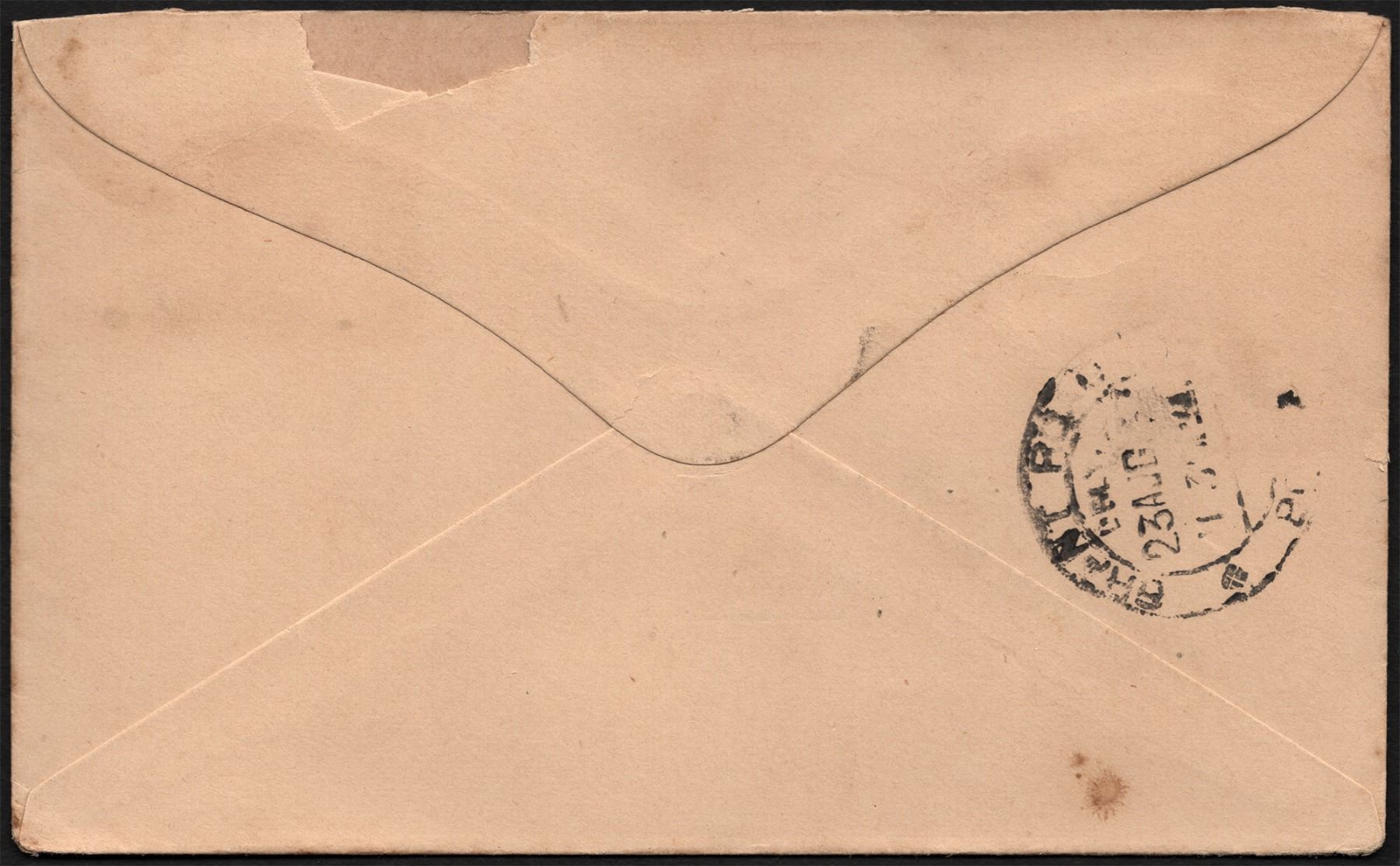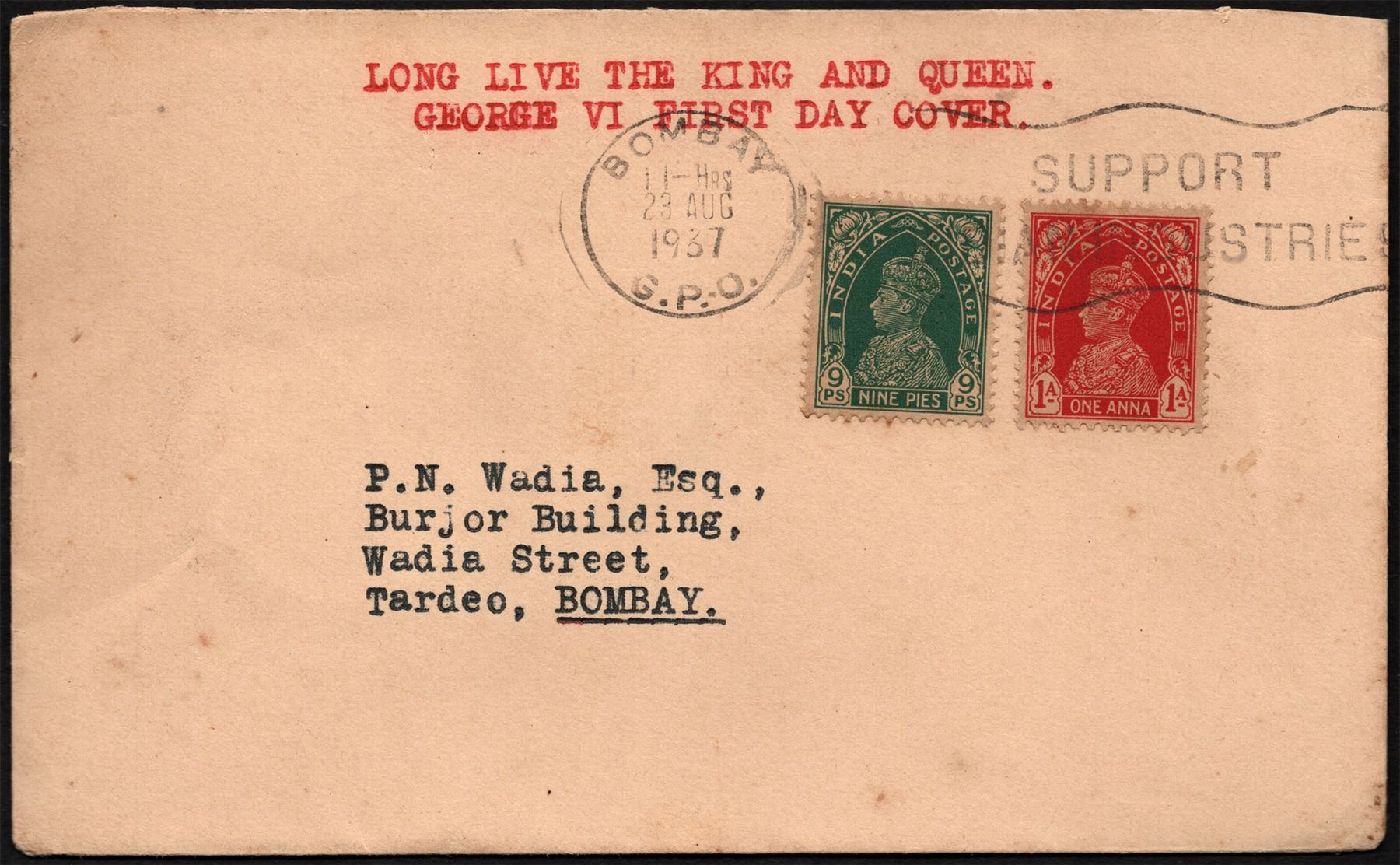 First Day Cover, 1937, George VI, 1 Anna and 9 Pies Stamps, both affixed on the front, with a slogan cancellation in a black roller seal as “SUPPORT | INDIAN INDUSTRIES", and a round seal as “BOMBAY | 11-HRS | 23 AUG | 1937 | G.P.O.”, along with a slogan in red on the front top of the cover as “LONG LIVE THE KING AND QUEEN. | GEORGE VI FIRST DAY COVER”, addressed to “P.N. Wadia, Esq., | Burjor Building | Wadia Street, | Tardeo, BOMBAY.”, The delivery seal is on the back as “GRANT ROAD | DELY. | 23 AUG | 7:30 AM”, some usual torn otherwise very good, Rare.
