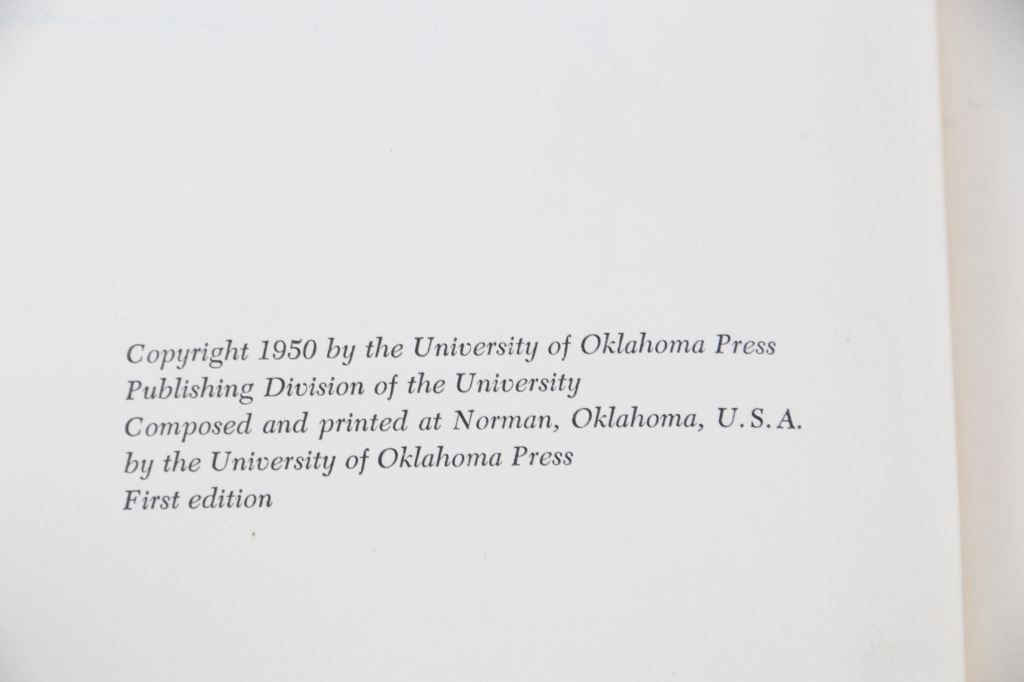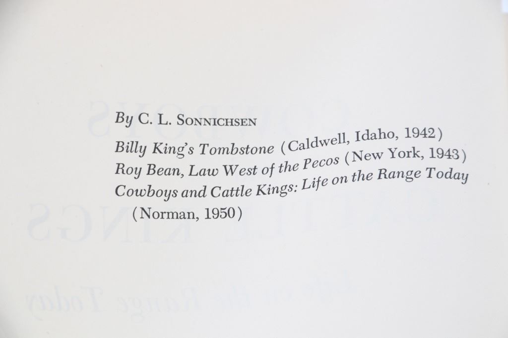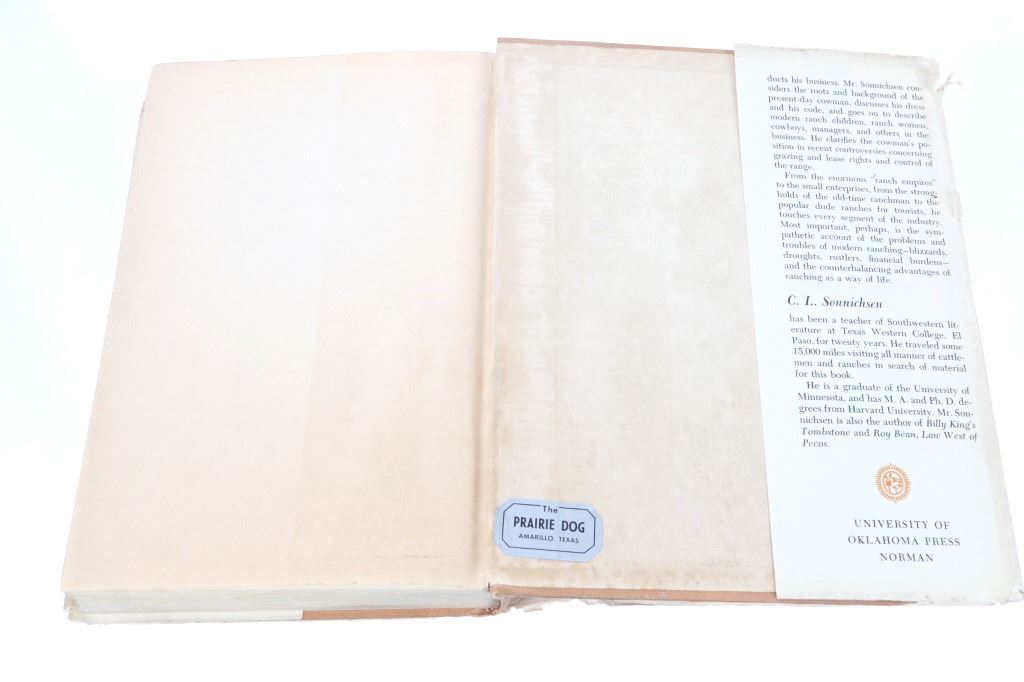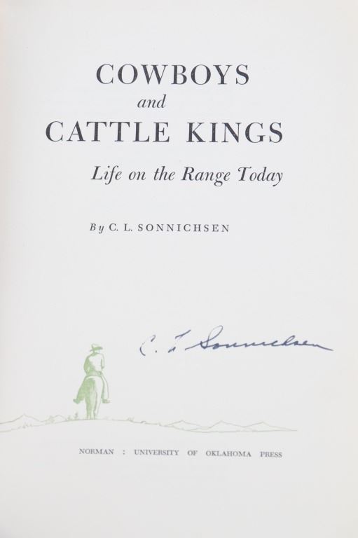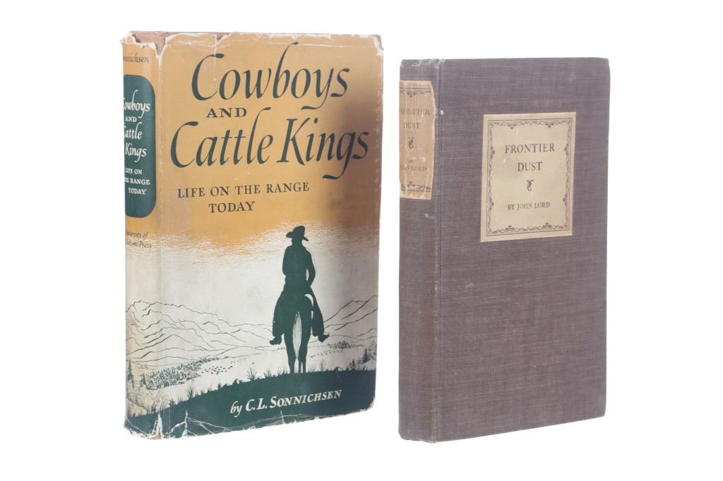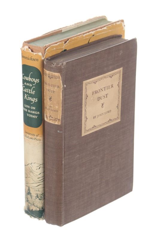 Offered in this lot is a pair of First Edition Western-theme books. The first book is the Rare "Cowboys and Cattle Kings- Life On The Range Today",1950, C.L. Sonnichsen, signed on the title page, illustrated. A detailed account of the lives of cowboys and cattle ranchers contemporary to the original publication of this book. Includes fascinating details of life on the plains in the mid twentieth century and a comparative look at the true Wild West, of great value to those interested in this iconic part of American history, not to be missed by collectors of such literature. Original paper dust jacket is worn but intact. The next book is "Frontier Dust" By John Lord, 1926. This First Edition has a forward by Natalie Shipman. This book tells the stories of the men "...who have left no records because they have never acquired a legend...". "Frontier Dust" is a historical fiction novel written by John Lord. Set in the late 19th century, the story follows the life of a young man named Jack who leaves his comfortable life in the East to seek adventure and fortune in the American West. Along the way, he encounters a variety of characters, including cowboys, outlaws, and Native Americans, and faces numerous challenges and dangers. As Jack navigates the harsh realities of life on the frontier, he must also confront his own inner demons and come to terms with the choices he has made. Along the way, he falls in love with a woman named Sarah, who shares his love of adventure and passion for life. Through vivid descriptions and engaging storytelling, Lord brings the Wild West to life, capturing the spirit of the era and the struggles of those who lived in it. With its richly drawn characters, compelling plot, and evocative setting, Frontier Dust is a captivating read for fans of historical fiction and Westerns alike. John Lord (1846-?) was born in Ohio in 1846; he rode with Buffalo Bill, ranched with Teddy Roosevelt, knew Billy the Kid, mined in Mexico and Leadville, Colorado; knew the James boys and was present when Bob Ford was killed; plus many other adventures. "Frontier Dust" has a brown cloth bound hardcover, measures 5.5"W x 8.75"L x 1"D. "Cowboys and Cattle Kings - Life On The Range Today" measures 6"W x 9.25"L x 1.25"D. Both books are in very nice condition, age tanning noted.