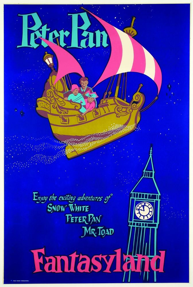 (Disneyland, 1956) Extremely rare version of the Disneyland Peter Pan's Flight attraction poster. As one of the first pulls of this hand-silkscreened poster, it has a small white border around the image, and black shadowing behind the lettering, both of which were removed from subsequent pulls. The is only the second example of this poster we have ever seen offered for sale. Measures 54"x36". The Bjorn Aronson designed poster has been restored and is in very good condition.