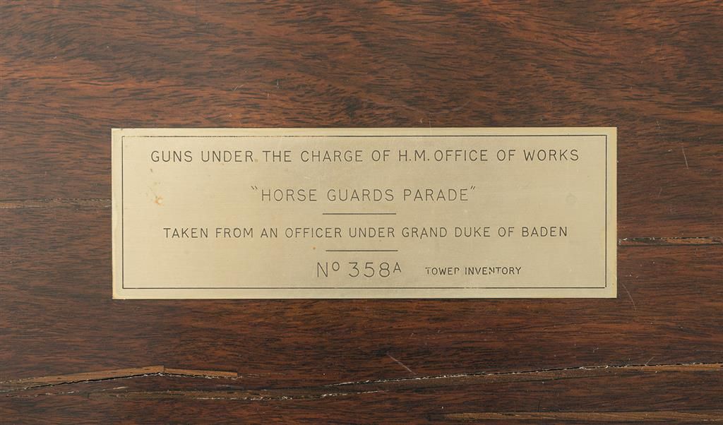 This is a nice example of a circa 1850s brass trimmed wooden case for a pair of Colt Dragoons. The case is constructed of walnut with inlaid brass edging and accents on the lid, as well as decorative trim and corner reinforcements. The case also has the brass corner reinforcements. The interior is lined with green felt and there are 9 compartments, three with lids. There is a brass escutcheon around the skeleton key hole (key not included). The lid has a inset plaque which reads "GUNS UNDER THE CHARGE OF H.M. OFFICE OF WORKS/"HORSE GUARDS PARADE"/TAKEN FROM AN OFFICER UNDER GRAND DUKE OF BADEN/No 358A TOWER INVENTORY". The case comes with a letter on "Guns With A History" letter head which explains that the H.M. Office of Works is the department that handles castle construction. The King's own architects and surveyors. The Horse Guards Parade is a parade ground next to Whitehall, London and that the only time that guns could have been taken from an officer under Duke of Baden was during the Crimean War, 1853 to 1856. At this time the researcher was unable to find record for the Tower inventory number. The researcher concluded that this case is definitely vintage 1850s.