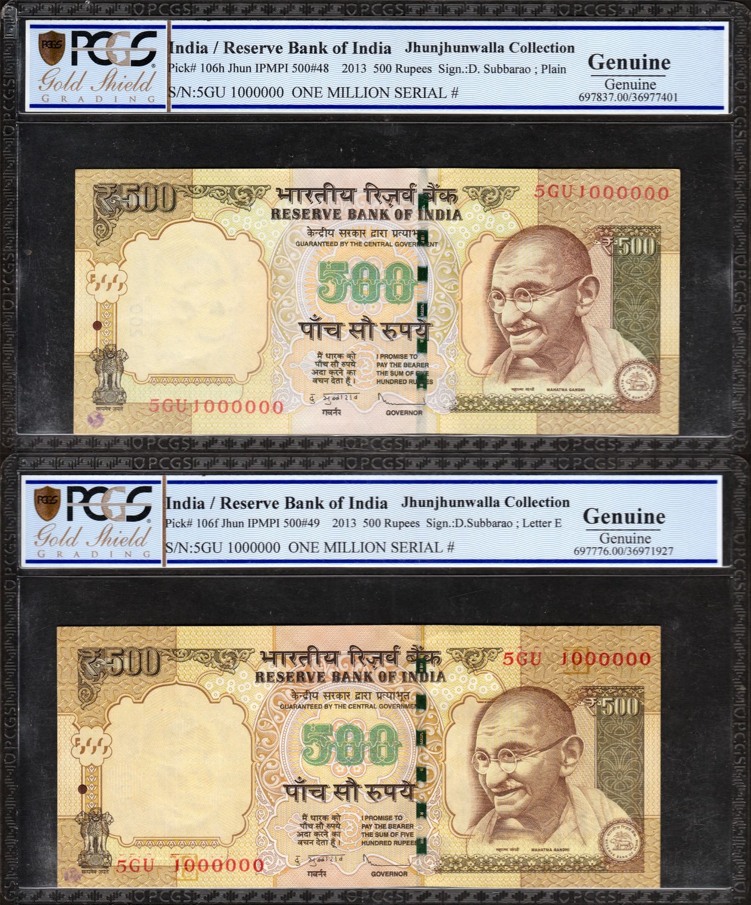 Republic India, 2013, 500 Rupees, Super Fancy Pair, 1000000, Signed by D. Subbarao, Plain & E Inset, GU Prefix, S. No. 5GU 1000000, graffiti, graded by PCGS Genuine, Ex Kishore Jhunjhunwalla Collection, Rare.