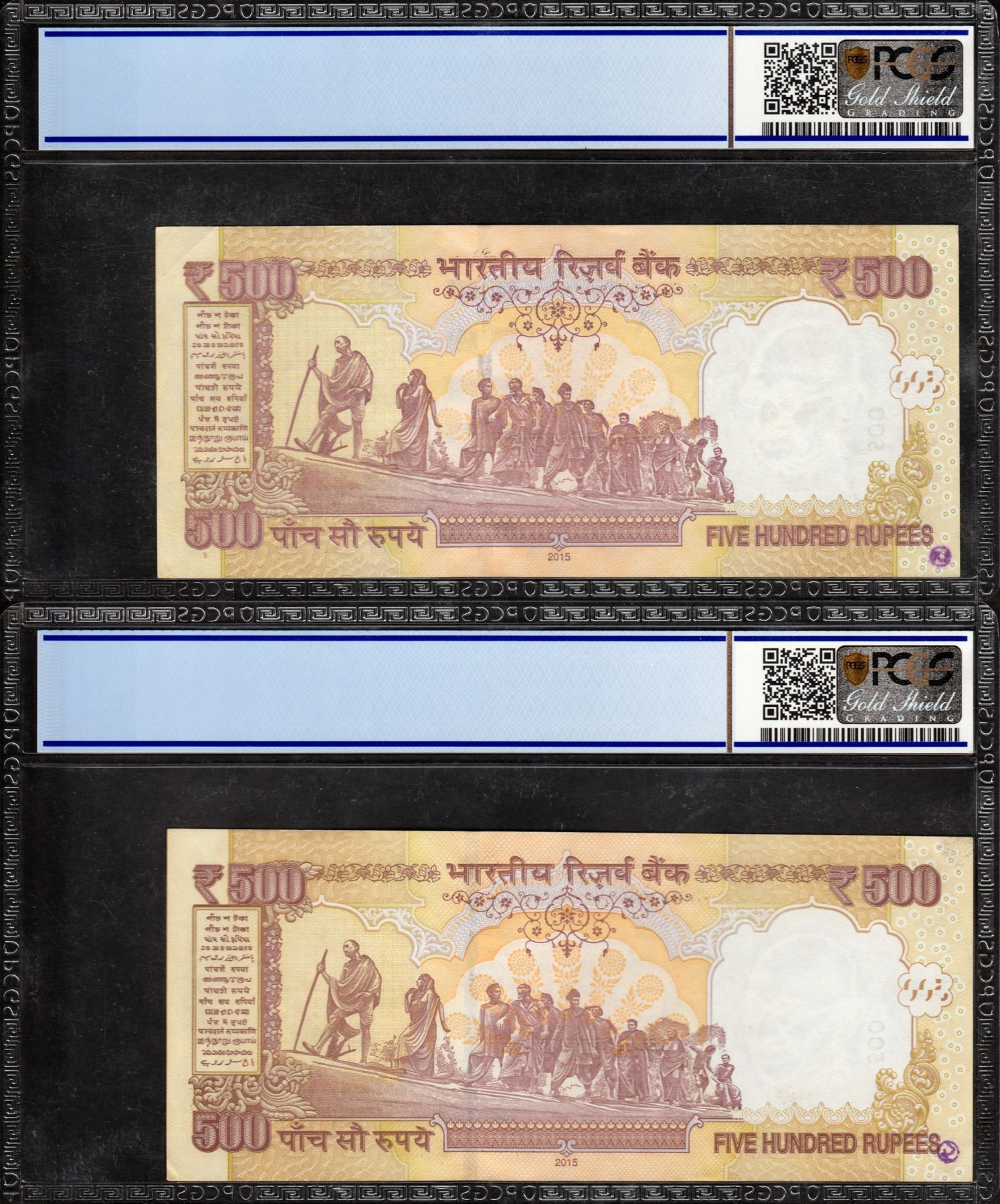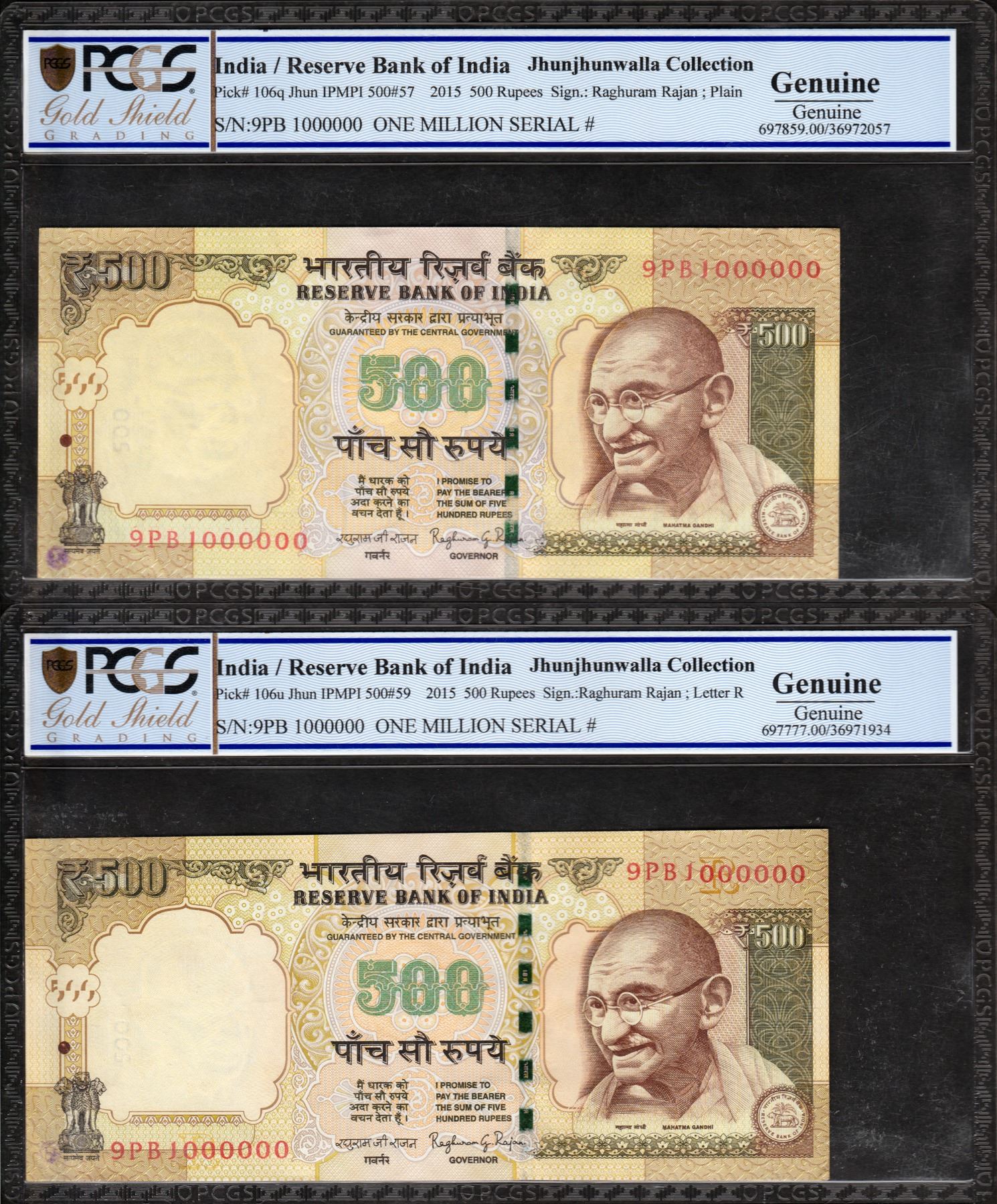 Republic India, 2015, 500 Rupees, Super Fancy Pair, 1000000, Signed by Raghuram G Rajan, Plain & R Inset, PB Prefix, S. No. 9PB 1000000, graffiti, graded by PCGS Genuine, Ex Kishore Jhunjhunwalla Collection, Rare.