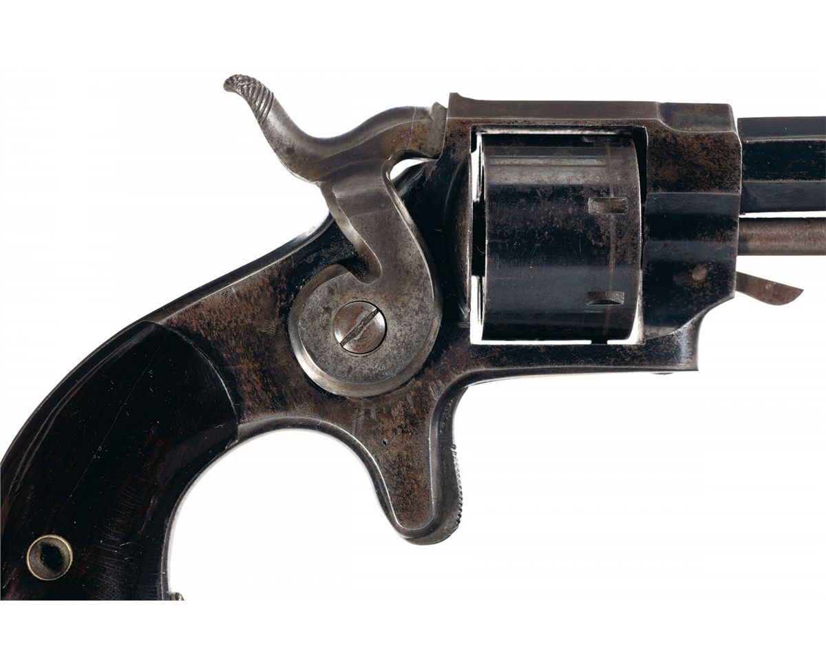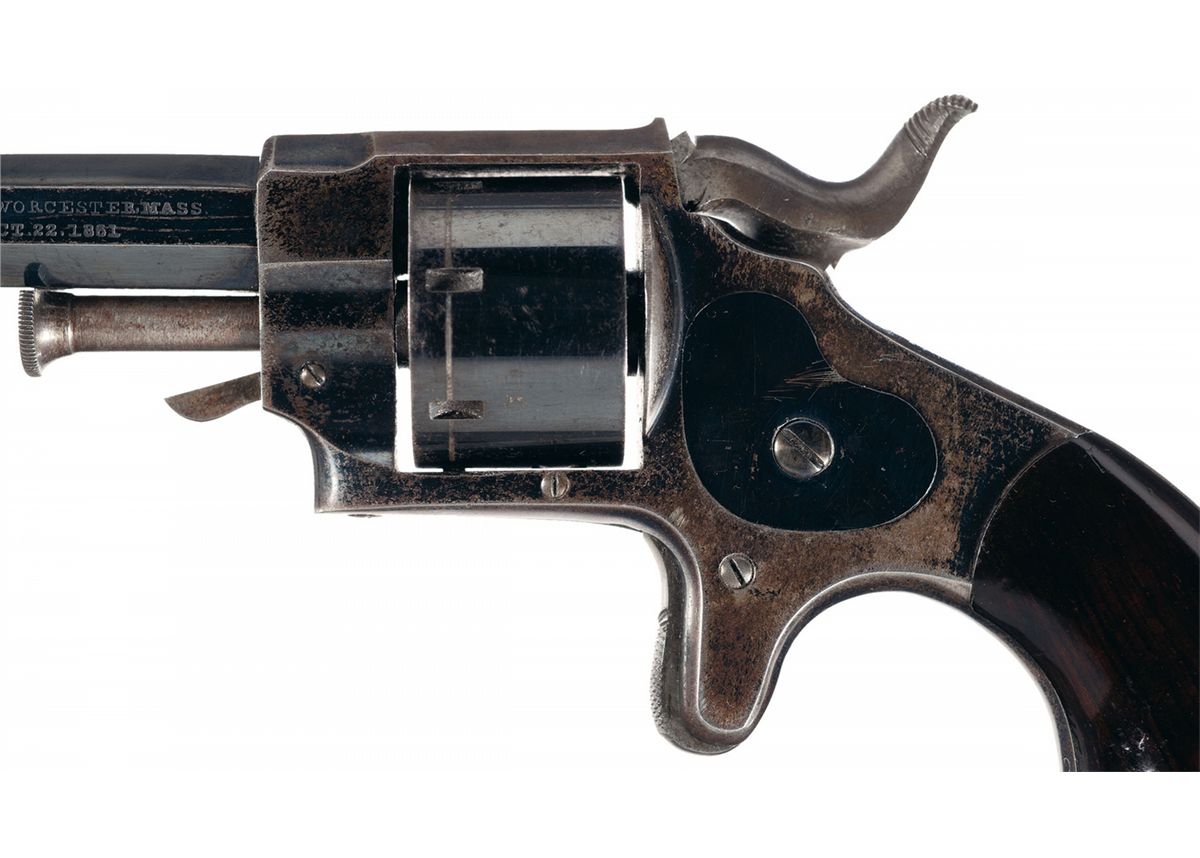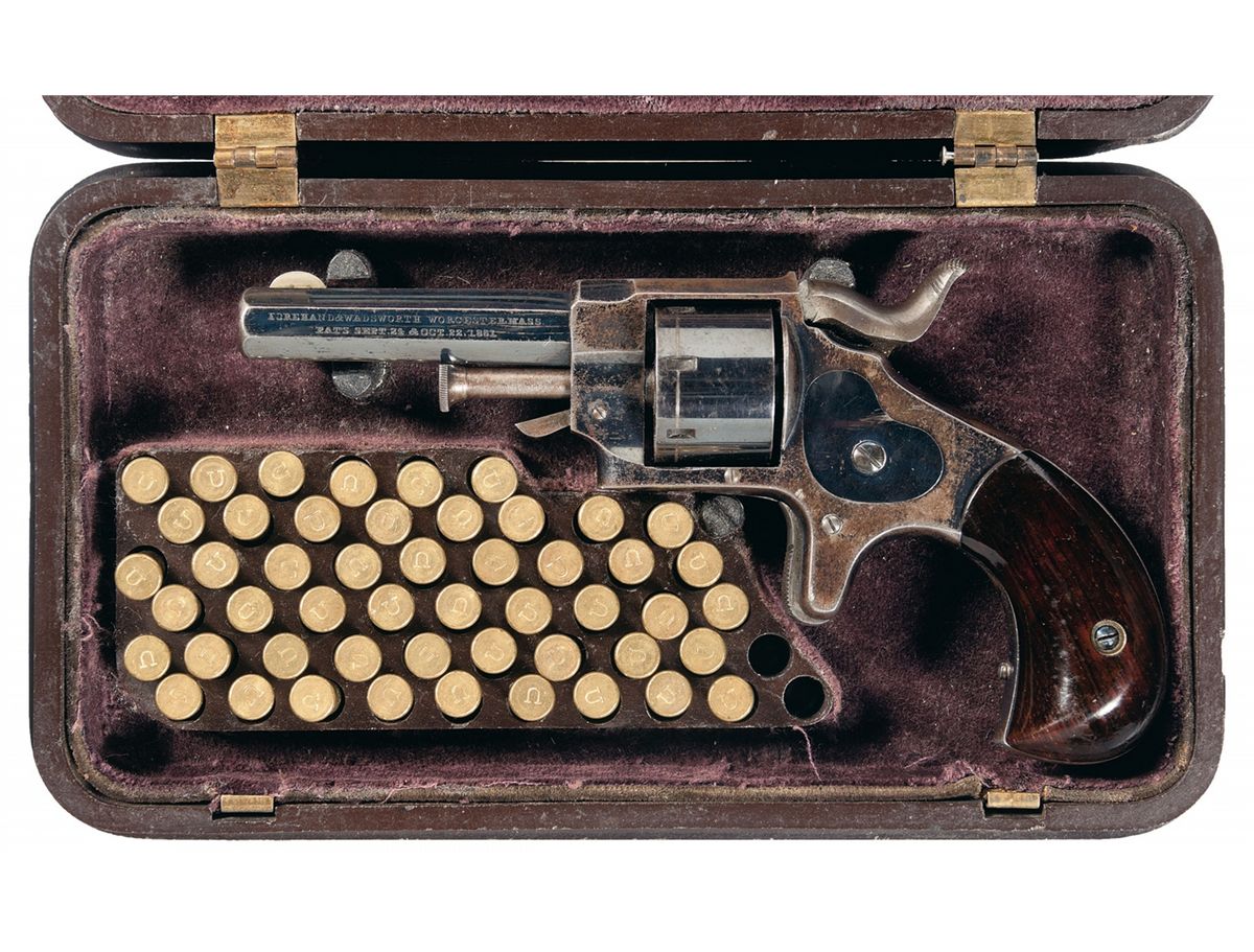 One of approximately 1,000 Forehand & Wadsworth Side Hammer 22 Revolvers manufactured in the 1870s. The left barrel has the two line address/patent dates marking and the 7-shot cylinder is plain. Matching numbers on frame, barrel, cylinder pin, grips and cylinder. Fitted with varnished bird head grips. With a gutta percha case lined in purple velvet with a cartridge block and 50 "U" head stamped 22RF cartridges.