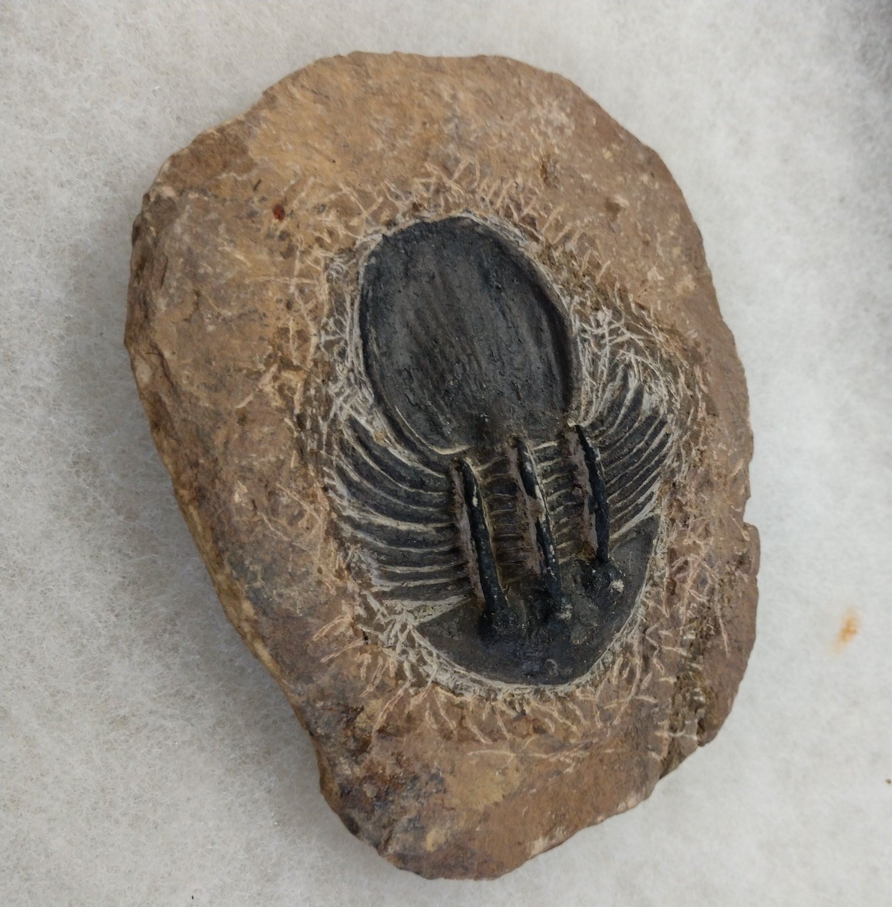 Rare Fossil Trilobite, pre-historic item. Made of sandstone, the item measures 5" x 4" x 1". Morocco. Condition: As found, see images. Shipping: $15.50 w/insurance and signature.