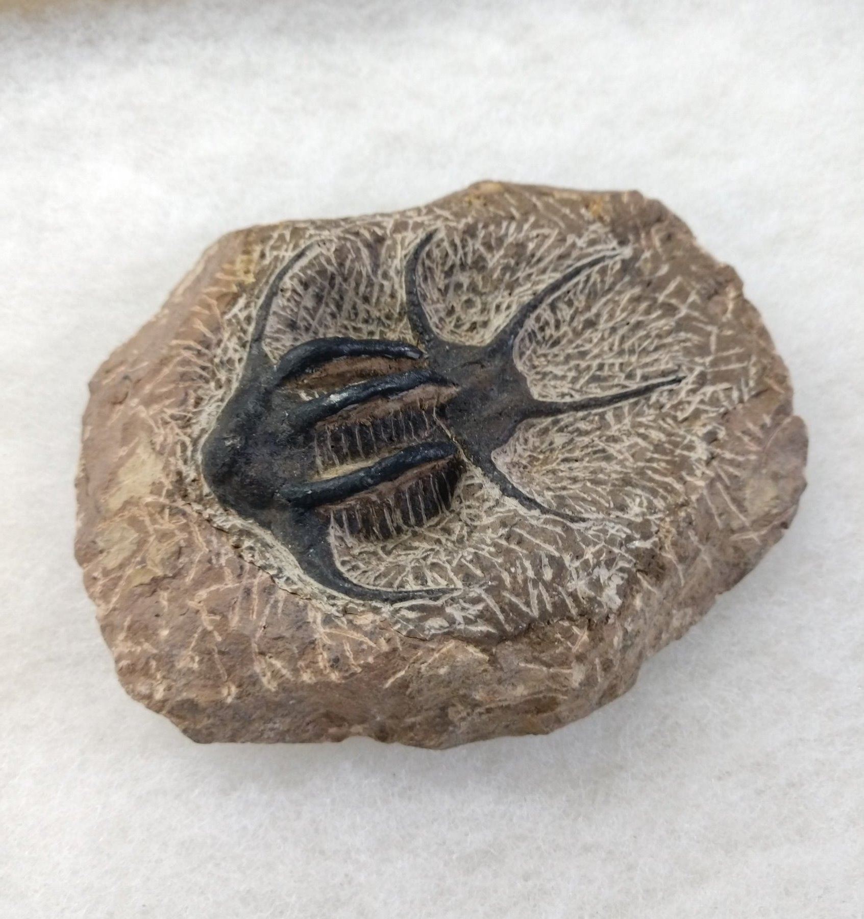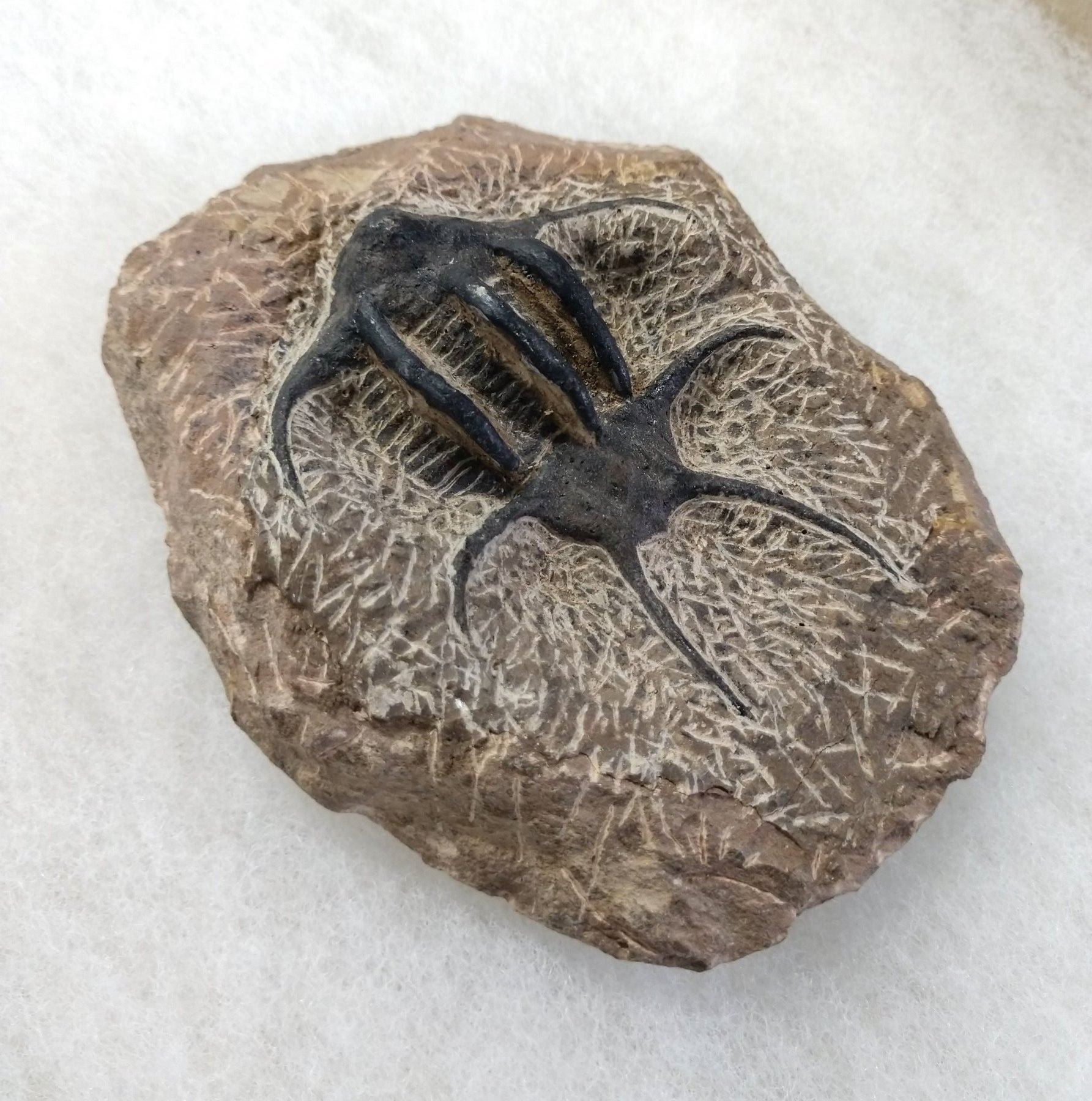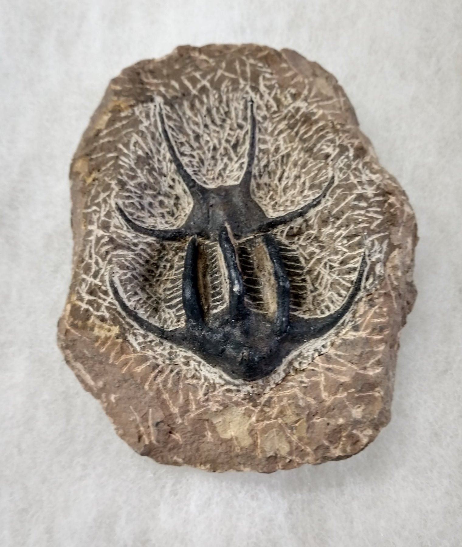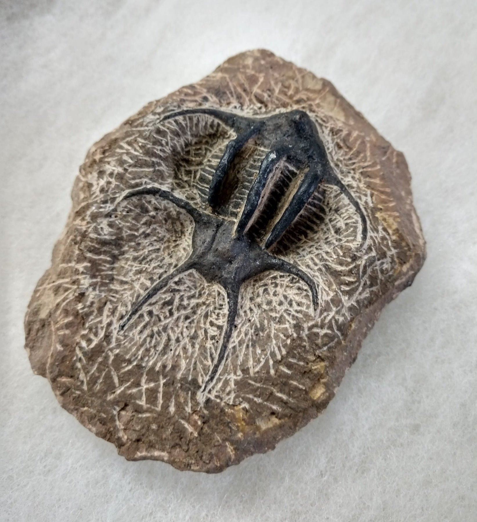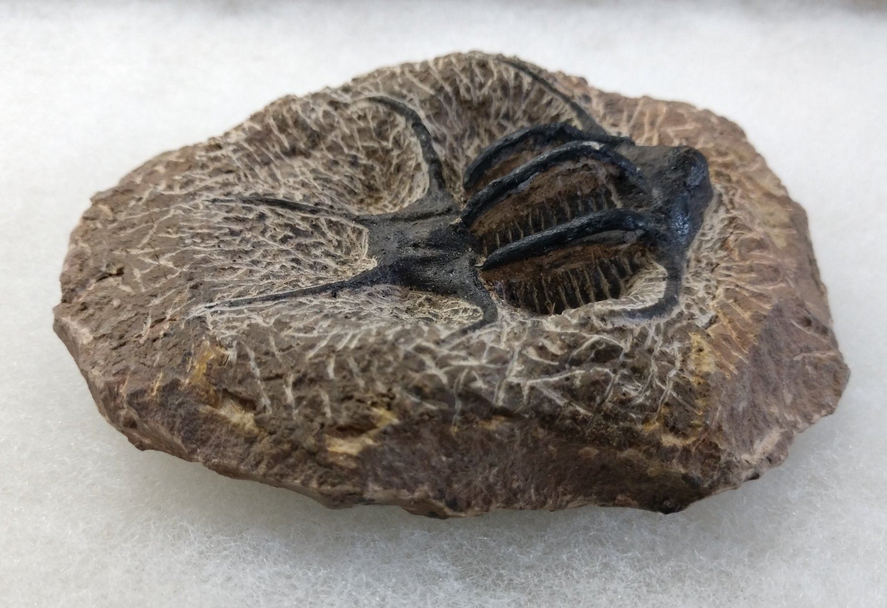 Rare Fossil Trilobite, pre-historic item. Made of sandstone, the item measures 3 1/2" x 3" x 1". Morocco. Condition: As found, see images. Shipping: $15.50 w/insurance and signature.