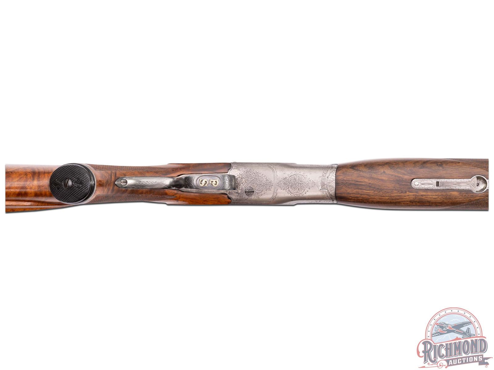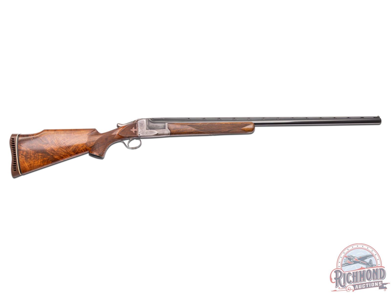 Made by Savage Arms in 1935. One of four guns known in this configuration made that year and one of 570 total with Savage construction numbers under sixty guns total. Gun has standard 32" modified choke blued Chromax steel barrel with factory ventilated rib in 12 gauge with 2-3/4" chambers. Case-hardened "JE" Grade engraved boxlock action with single trigger and no safety. Blued trigger guard with gold "PS" initials on trigger bow. Non-factory walnut Monte Carlo stock with right hand cheekpiece and Pachmayr vented recoil pad. Factory checkered competition style forend with latch release. LOP: 14". DAC: 2". DAH: 3". CALIBER: 12 GA. S/N: 400555. FFL STATUS: Curio & Relic.